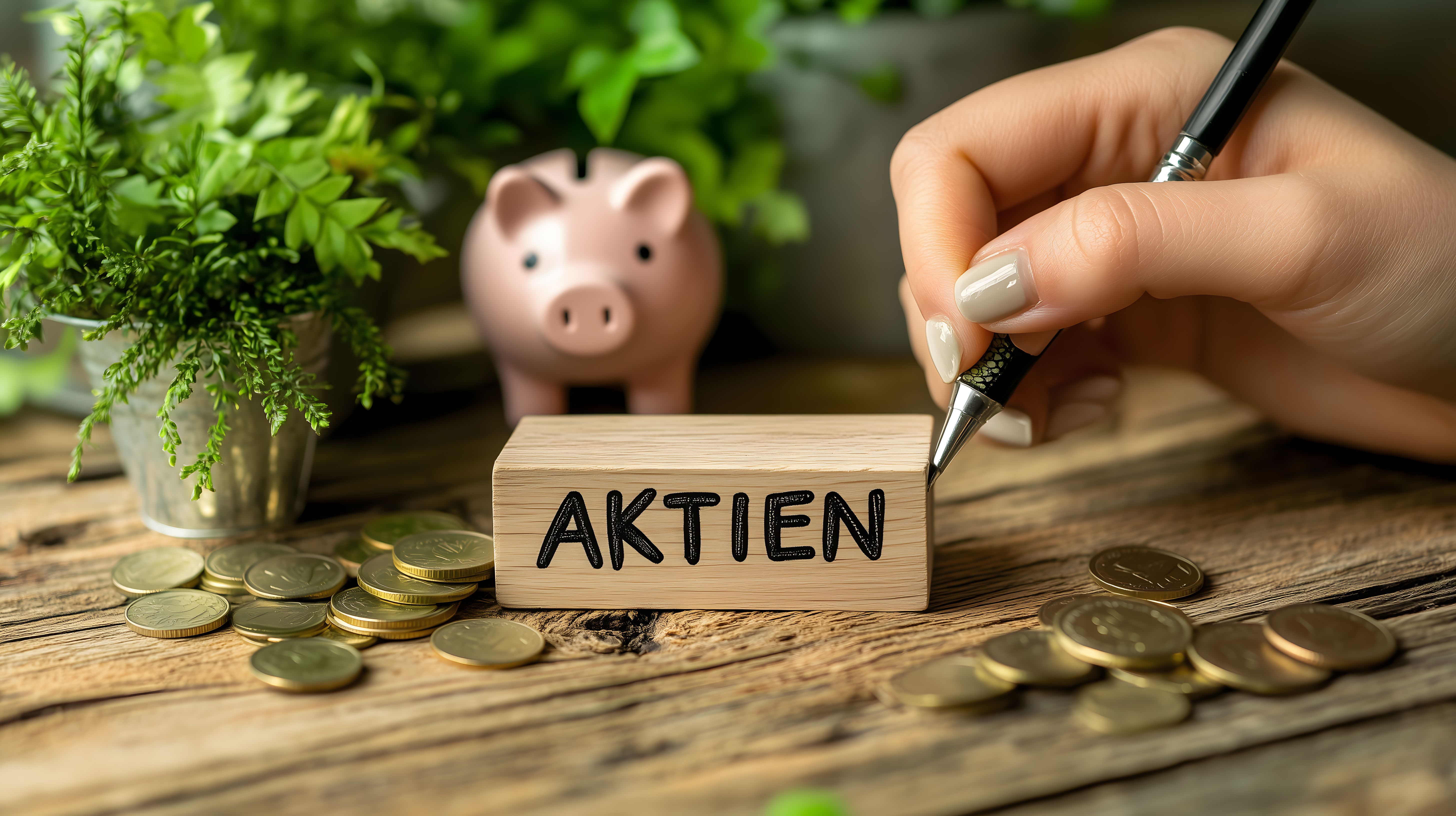 Das Foto zeigt einen rustikalen Holztisch, auf dem ein Sparschwein, einige Münzen und ein Holzwürfel mit der Aufschrift 'Aktien' zu sehen sind. Eine Hand hält einen Stift und scheint gerade etwas auf den Würfel zu schreiben. Die Umgebung ist grün und natürlich, mit Pflanzen im Hintergrund, was eine friedliche und entspannte Atmosphäre vermittelt.