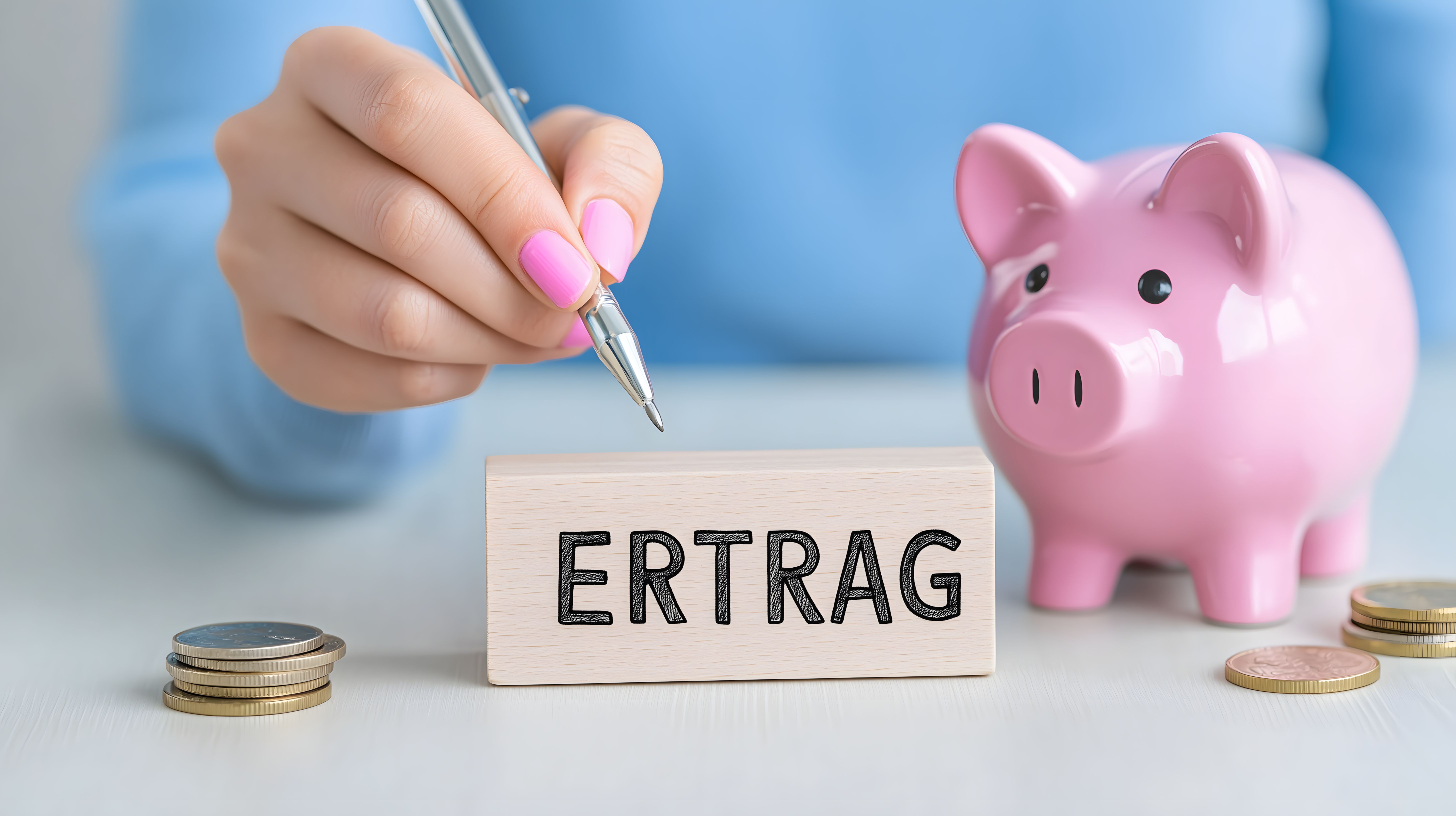 Dieses Bild zeigt eine Nahaufnahme eines rosa Sparschweins neben einem Holzwürfel mit dem Wort 'ERTRAG' darauf. Auf dem Schreibtisch befinden sich auch Münzen, was das Thema der Finanzplanung und des Einkommens unterstreicht. Eine Hand mit einem rosa lackierten Fingernagel hält einen Stift, als würde sie gerade etwas notieren. Das Bild vermittelt insgesamt den Eindruck einer sorgfältigen Finanzplanung und Buchhaltung. Es eignet sich hervorragend als kostenloses Stockfoto mit hoher Auflösung für Blogs, Newsletter, Social-Media-Posts oder Werbematerialien zum Thema Wirtschaft, Finanzen und Investitionen. Die Lizenz ist unter Creative Commons frei nutzbar.
