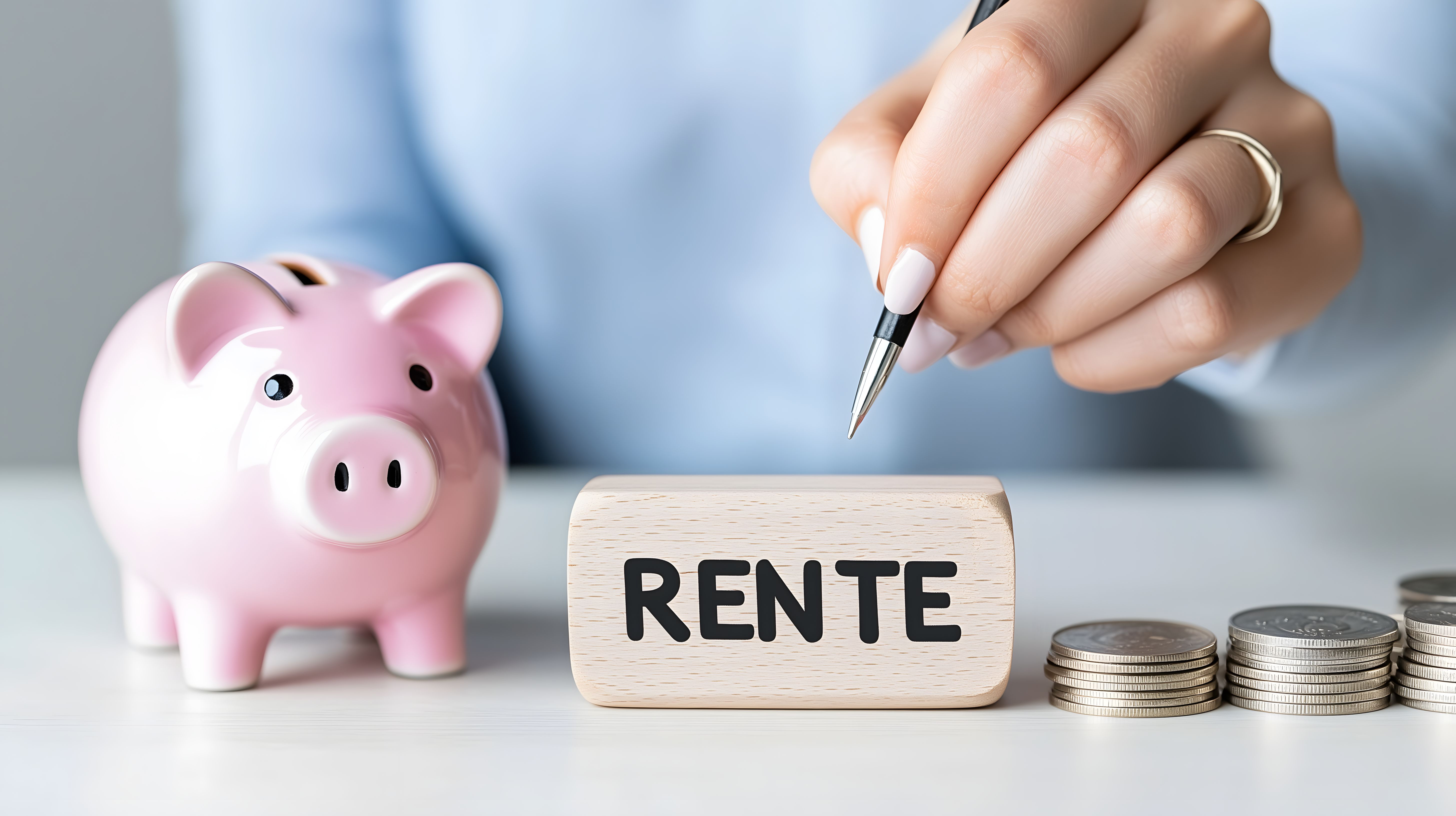 Das Bild zeigt eine Hand, die einen Bleistift in der Hand hält und auf ein hölzernes Schild mit der Aufschrift 'RENTE' zeigt. Daneben steht ein rosa Sparschwein sowie einige Münzstapel, die die finanzielle Komponente des Themas Altersvorsorge symbolisieren. Die Perspektive ist nah und fokussiert auf diese Elemente, was die Aufmerksamkeit des Betrachters auf das Thema Rente und Rentesparen lenkt.
