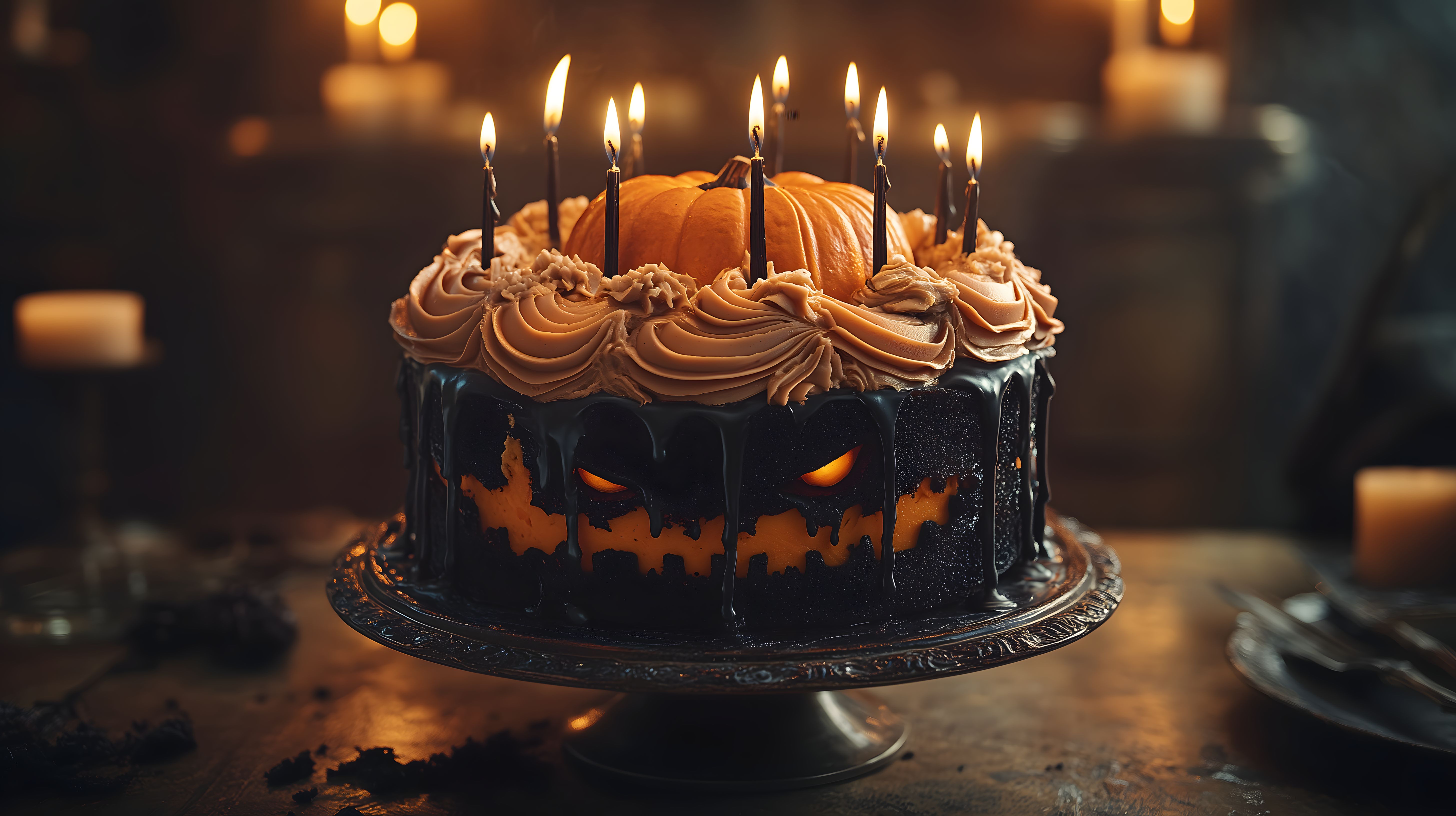 Dieses Foto zeigt einen dunklen, gruseligen Halloween-Kuchen mit einer Schicht Schokolade und einer Krone aus Sahne. In der Mitte thront ein orange geschnitzter Kürbis, umgeben von brennenden schwarzen Kerzen. Die Stimmung ist geheimnisvoll und passend zur herbstlichen Jahreszeit. Dieser kreative Kuchen wäre ein perfekter Hingucker für eine Halloween-Party oder -Feier und kann als kostenloses Stockfoto in hoher Auflösung unter einer Creative-Commons-Lizenz verwendet werden.