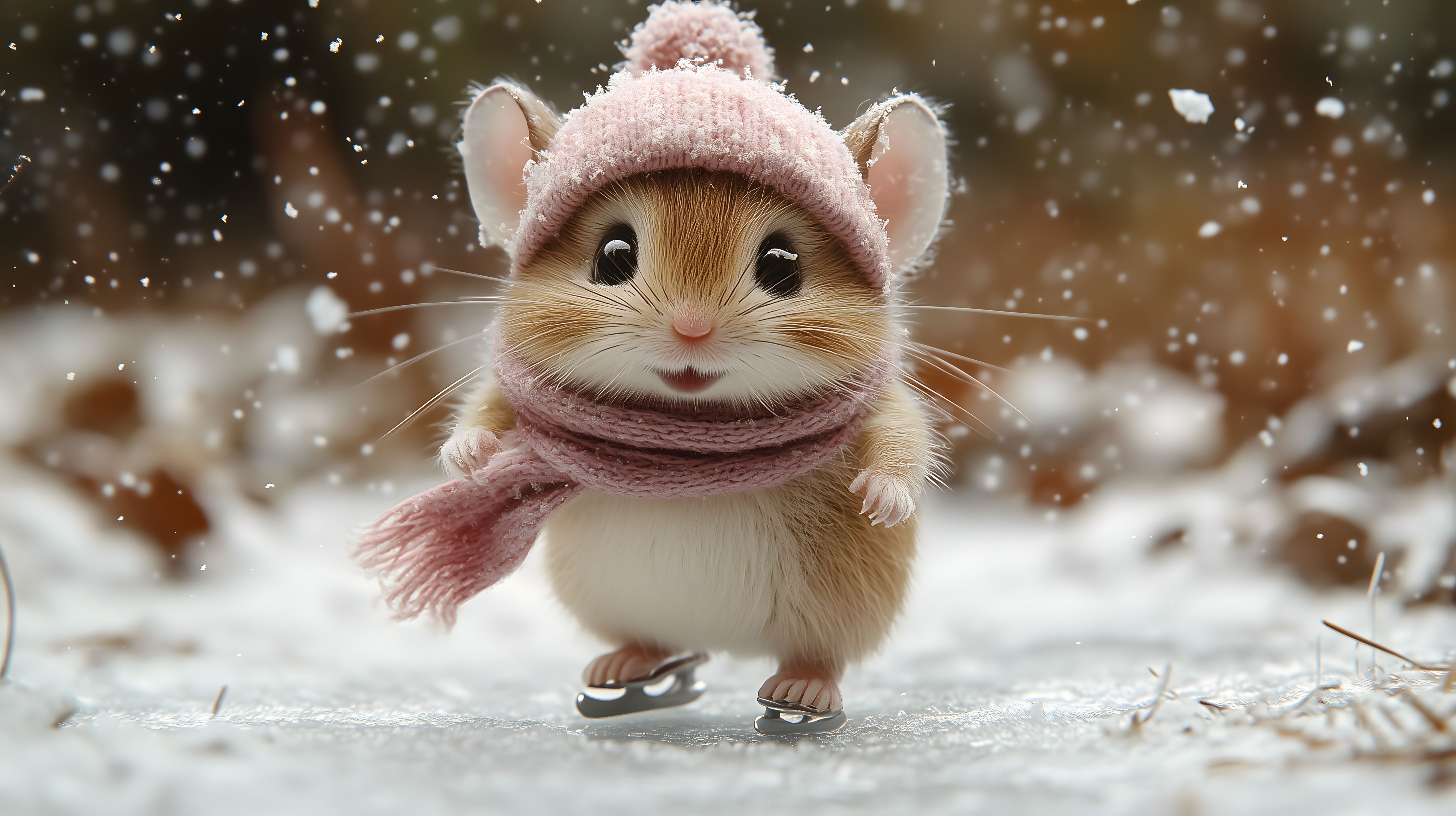 Das Bild zeigt eine kleine, niedliche Maus in einer winterlichen Szene. Sie trägt einen rosa Strickmützchen und Schal und läuft auf dem Eis mit Schlittschuhen. Im Hintergrund sieht man Schneeflocken, die durch die Luft wirbeln. Das Foto ist in einem warmen, goldenen Farbton gehalten, was eine gemütliche und feierliche Atmosphäre schafft. Diese Aufnahme wäre perfekt für die Verwendung in Weihnachts-Dekorationen, Urlaubskarten, Kalendern oder anderen saisonalen Gestaltungen. Das hochauflösende Stockfoto steht unter einer Creative Commons-Lizenz zur kostenfreien Nutzung zur Verfügung.