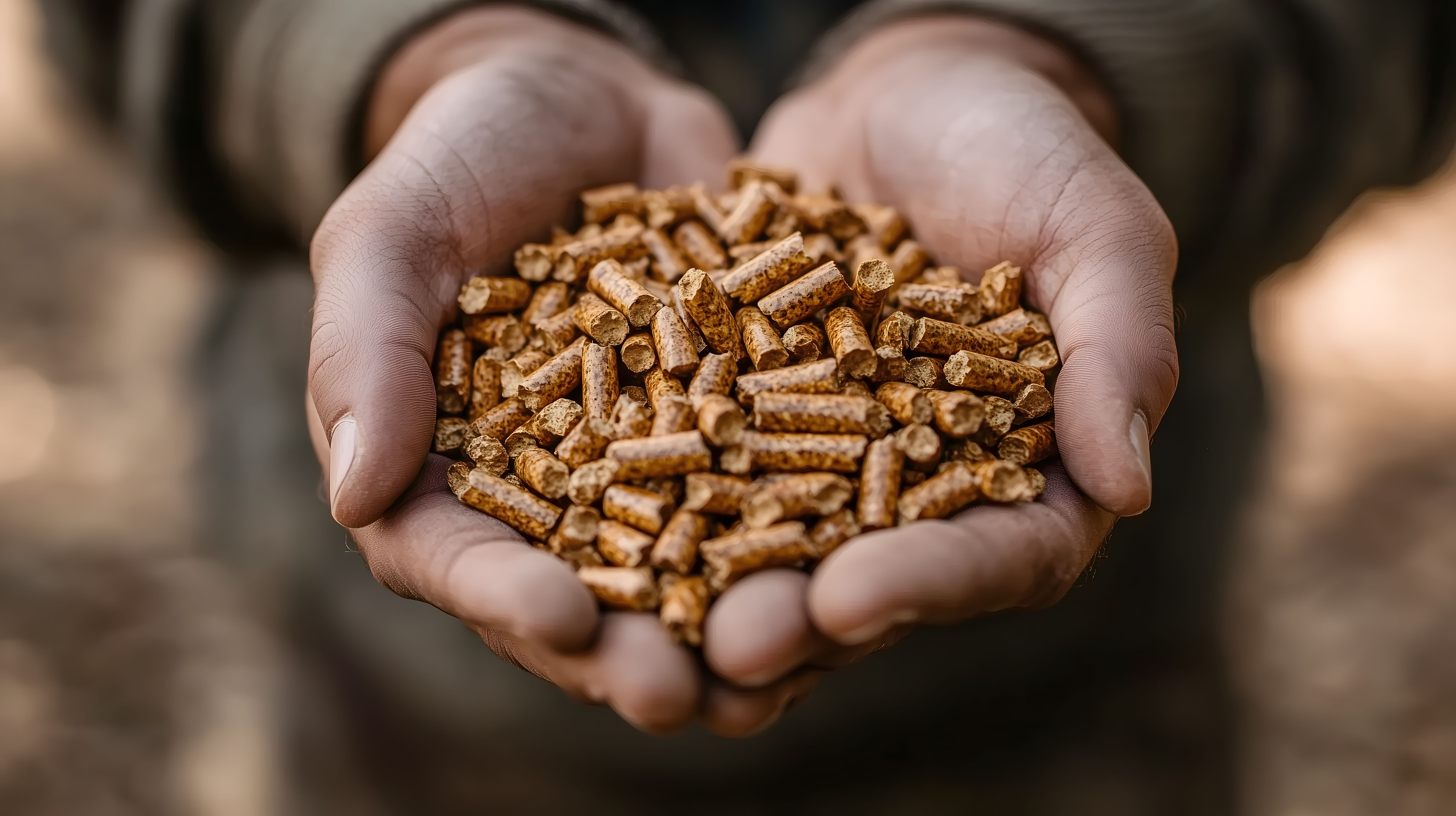 Das Foto zeigt einen Mann, der eine Handvoll Holzpellets in seinen Händen hält. Die braunen, zylindrischen Pellets sind deutlich sichtbar und kontrastieren mit den dunkel gefärbten Händen des Mannes. Die Perspektive legt den Fokus auf die Pellets und verleiht dem Bild eine natürliche, rustikale Atmosphäre.