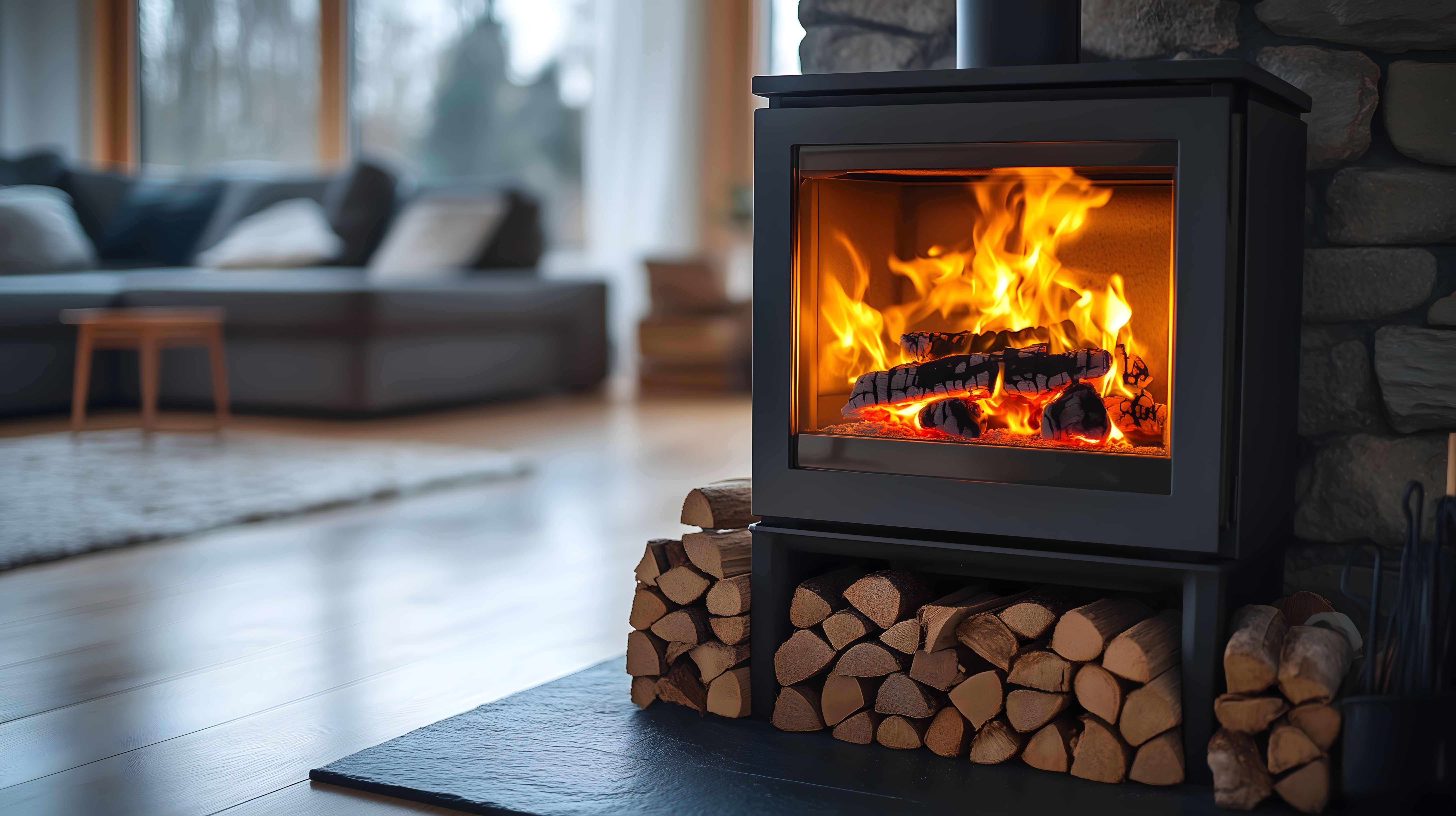 Das Bild zeigt ein gemütliches Wohnzimmer mit einem modernen Holzofen als Blickfang. Der Ofen steht vor einer großen Fensterfront, durch die man einen Blick auf die verschneite Winterlandschaft werfen kann. Der Raum ist in warmen Farbtönen gehalten und lädt zum Entspannen ein. Neben dem Ofen befinden sich Holzstapel, die für eine kontinuierliche Wärmezufuhr sorgen. Das Foto vermittelt eine behagliche, heimelige Atmosphäre und eignet sich perfekt für den Einsatz in Blogs, Newslettern oder Social-Media-Kanälen rund um Einrichtung, Wohnen und Lifestyle. Dieses hochwertige Stockfoto ist in hoher Auflösung und unter einer Creative-Commons-Lizenz verfügbar.