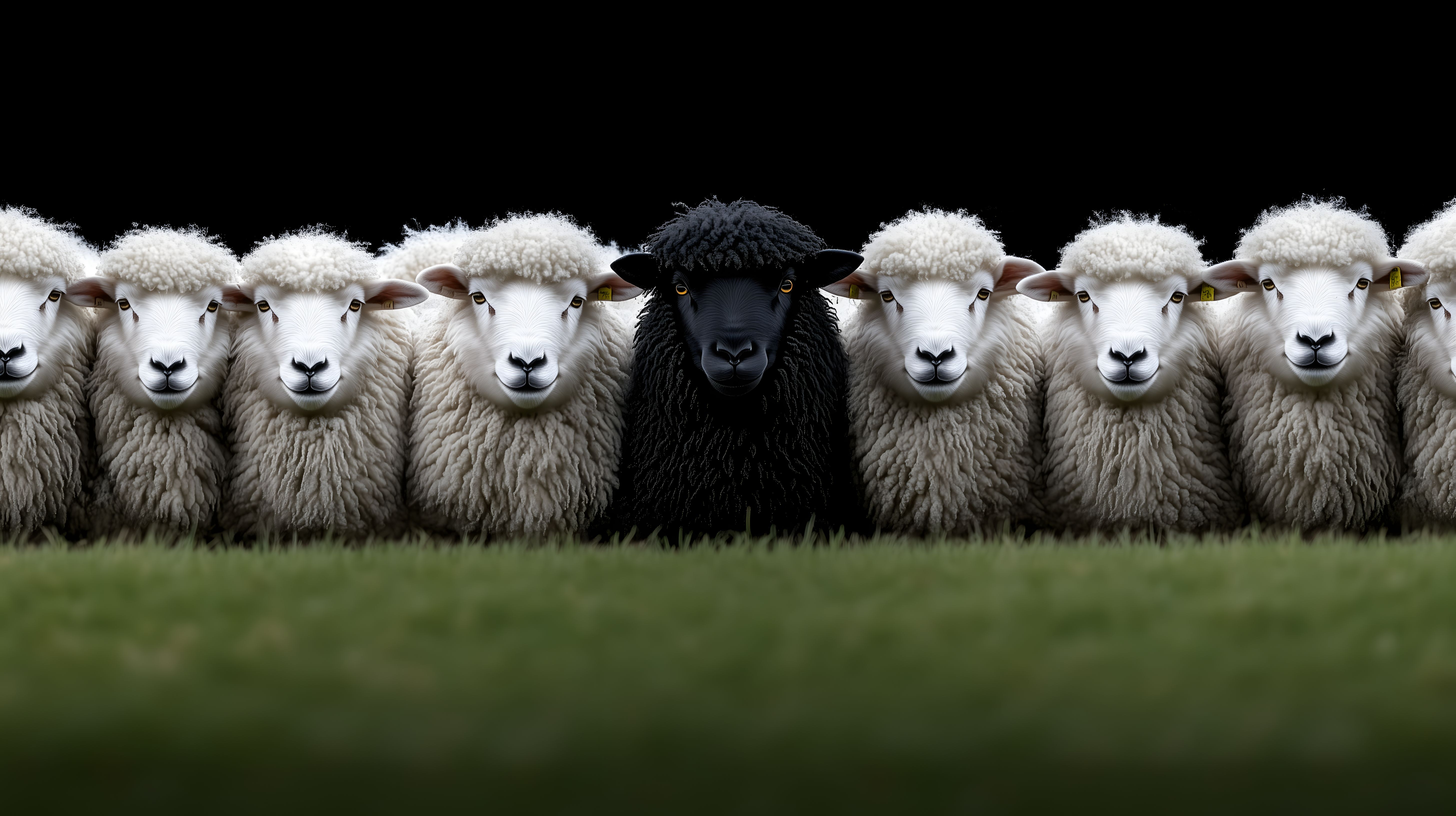 Das Bild zeigt eine Herde von weißen Schafen, in deren Mitte sich ein schwarzes Schaf befindet. Durch den starken Kontrast zwischen dem schwarzen Schaf und den weißen Schafen wird die Einzigartigkeit und Individualität des schwarzen Schafes hervorgehoben. Die Schafe sind vor einem dunklen Hintergrund zu sehen, was ihre Gesichter und Texturen besonders betont. Die Komposition ist symmetrisch und die Schafe blicken direkt in die Kamera, was dem Bild eine lebendige und natürliche Anmutung verleiht.