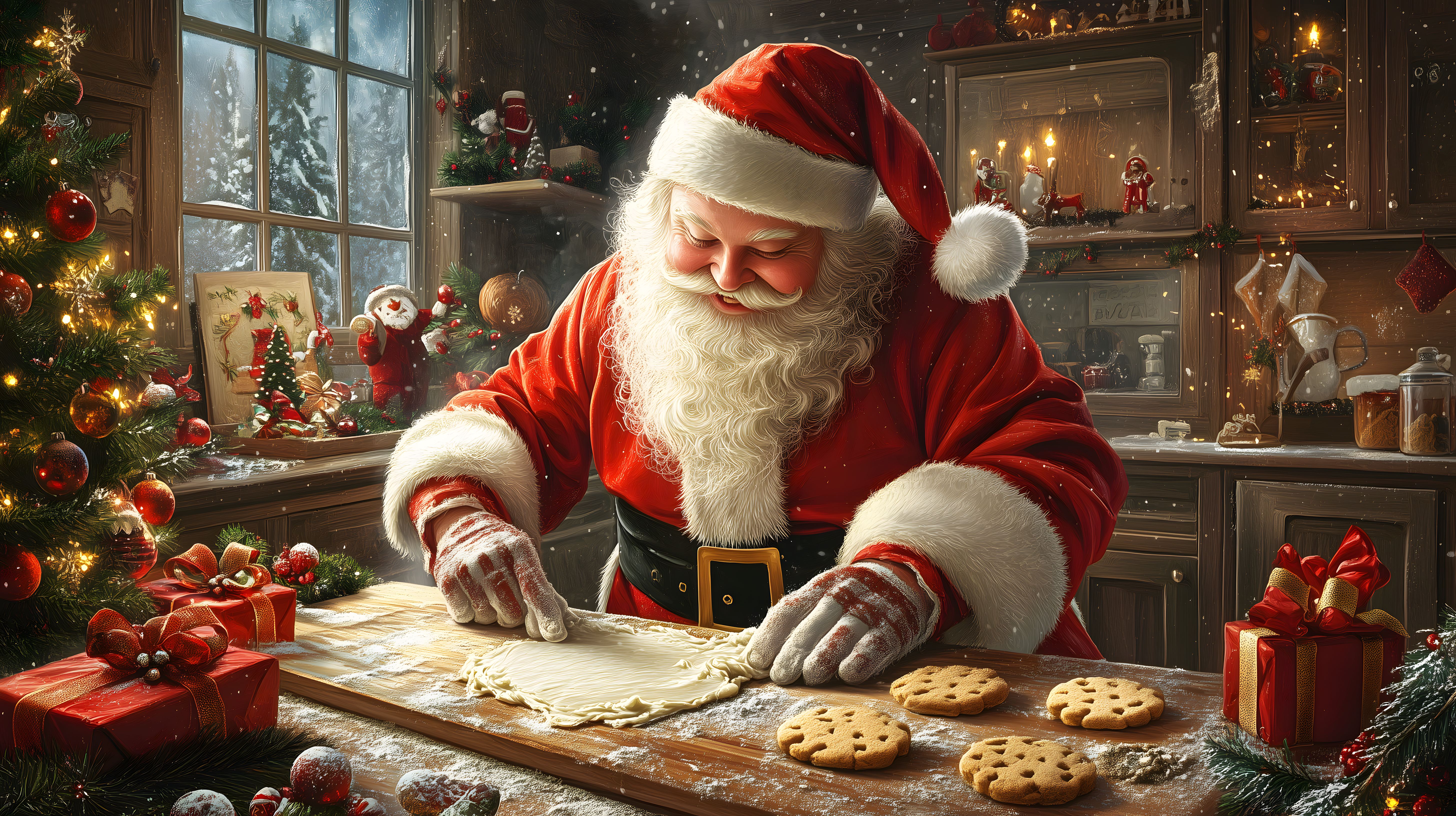 Das Bild zeigt den fröhlichen Weihnachtsmann, wie er in einer festlich geschmückten Küche Plätzchen backt. Er trägt sein traditionelles rotes Gewand mit weißem Fell und lächelt zufrieden, während er den Teig mit den Händen knetet. Im Hintergrund sieht man einen geschmückten Weihnachtsbaum, Kerzen und weitere Dekorationen, die eine winterliche und gemütliche Atmosphäre schaffen. Dieses stimmungsvolle Foto eignet sich hervorragend für Weihnachts-Websites, Social-Media-Kanäle, Blogbeiträge oder Werbekampagnen rund um die Feiertage. Als hochwertiges, kostenloses Stockfoto in hoher Auflösung unter Creative-Commons-Lizenz kann es vielfältig eingesetzt werden.