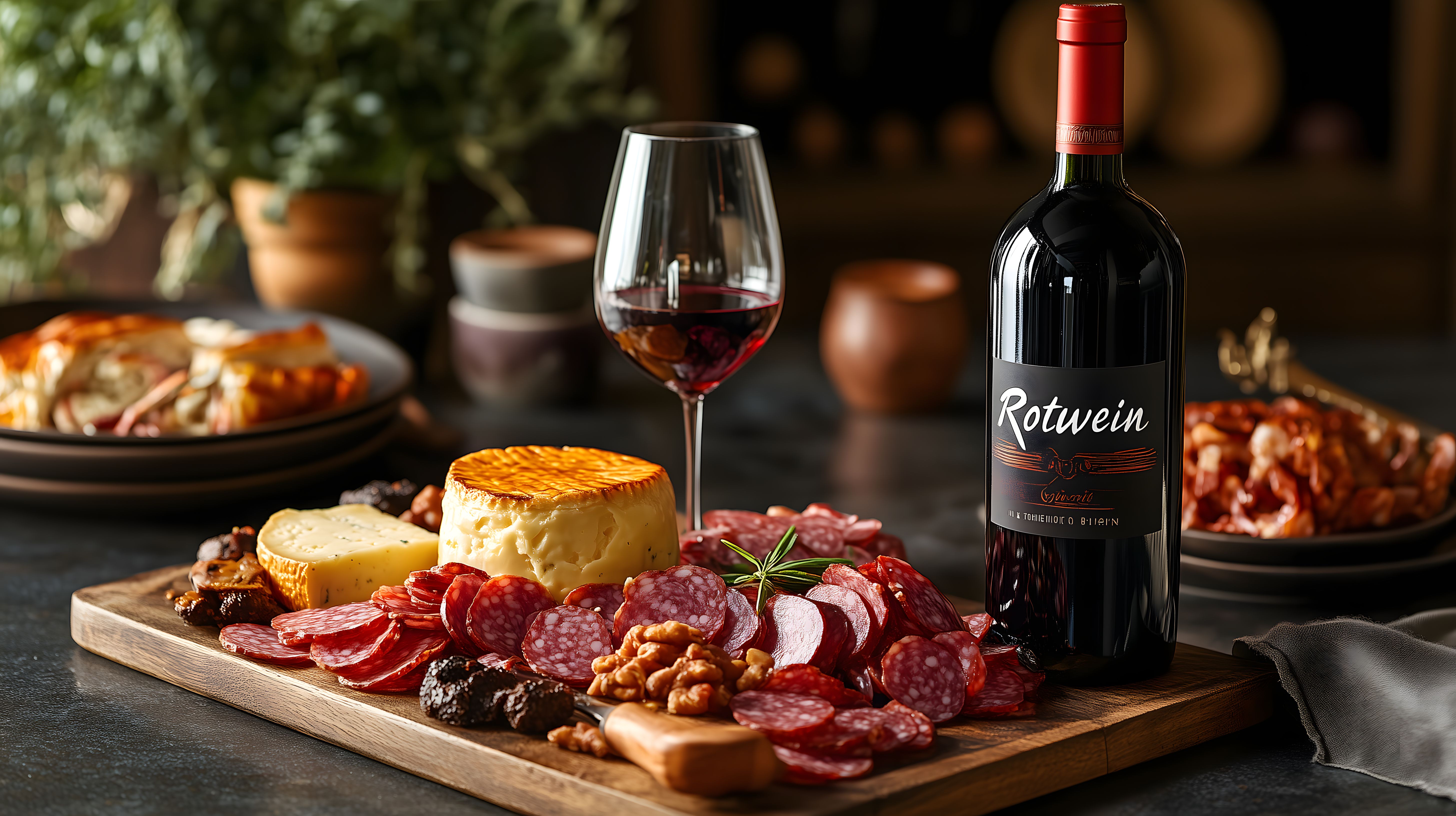 Dieses hochwertige Stockfoto zeigt eine elegante Wein- und Käseplatte mit einem Glas Rotwein. Auf einem rustikalen Holzbrett sind verschiedene Käsesorten, Salami, Oliven, Nüsse und Trauben angerichtet. Daneben steht eine Flasche Rotwein mit dem Label 'Rotwein'. Die Szene ist in einer dunklen, gemütlichen Atmosphäre inszeniert, was eine luxuriöse, feinschmeckerische Stimmung vermittelt. Dieses Foto eignet sich hervorragend für den Einsatz in Blogs, Newslettern, Social-Media-Beiträgen oder Werbematerialien zum Thema Wein, Käse, Feinkost und Gourmetküche. Das hochauflösende Bild ist unter einer Creative-Commons-Lizenz kostenlos für kommerzielle und private Zwecke verfügbar.