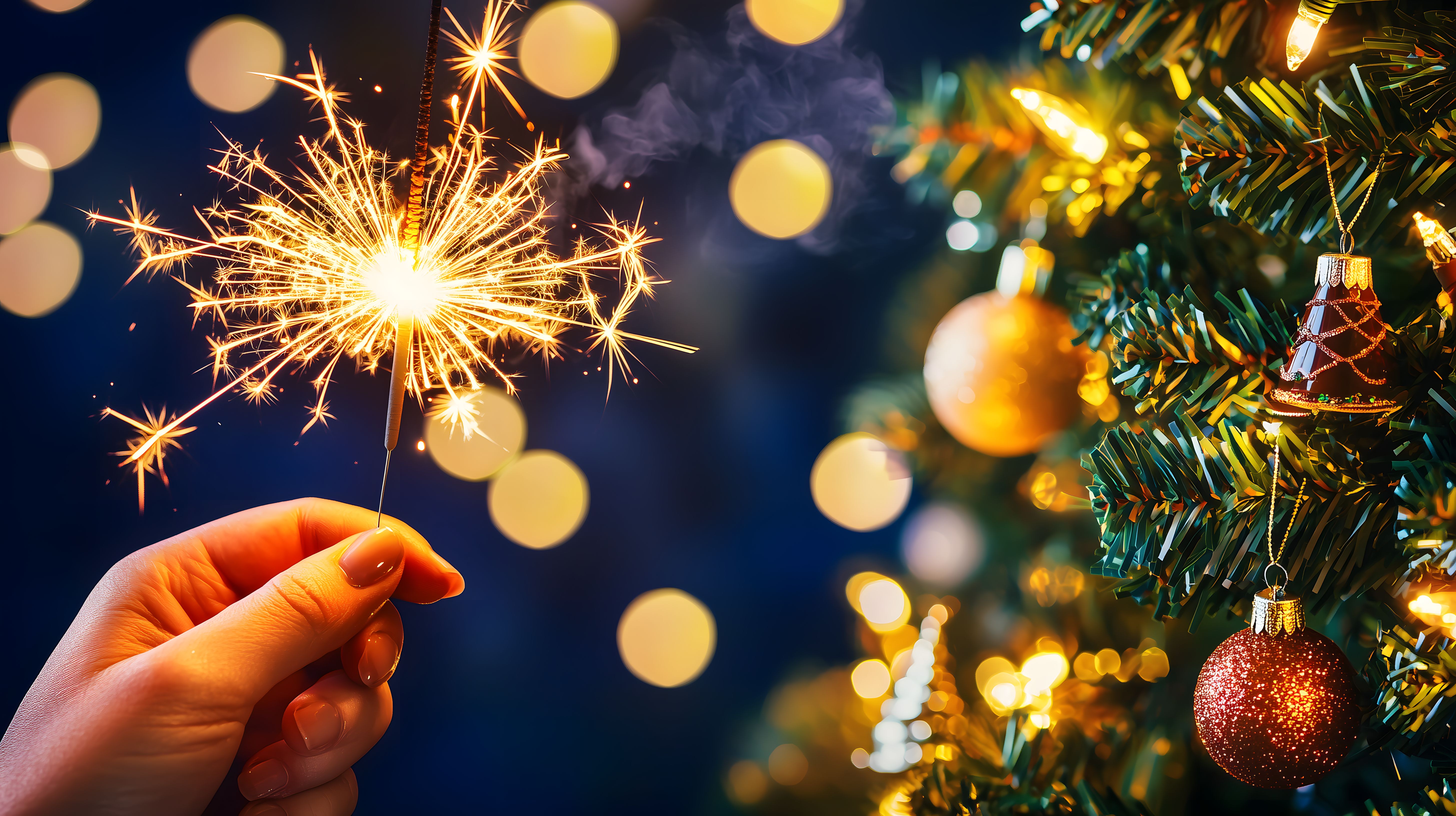 Dieses stimmungsvolle Foto zeigt eine Hand, die eine Wunderkerze vor einem unscharfen Hintergrund mit einem geschmückten Weihnachtsbaum hält. Die Wunderkerze ist hell erleuchtet und verbreitet eine festliche Atmosphäre. Der Christbaum im Hintergrund ist mit farbenfrohen Kugeln und Lichtern geschmückt, die in warmen Tönen erstrahlen. Das Zusammenspiel von Licht und Unschärfe erzeugt einen magischen, fast märchenhaften Effekt. Dieses Bild eignet sich perfekt für Weihnachtsdekorationen, Grußkarten, Einladungen oder als Hintergrundbild in Newslettern und auf Webseiten. Es steht unter einer kostenlosen Creative-Commons-Lizenz und ist in hoher Auflösung verfügbar.