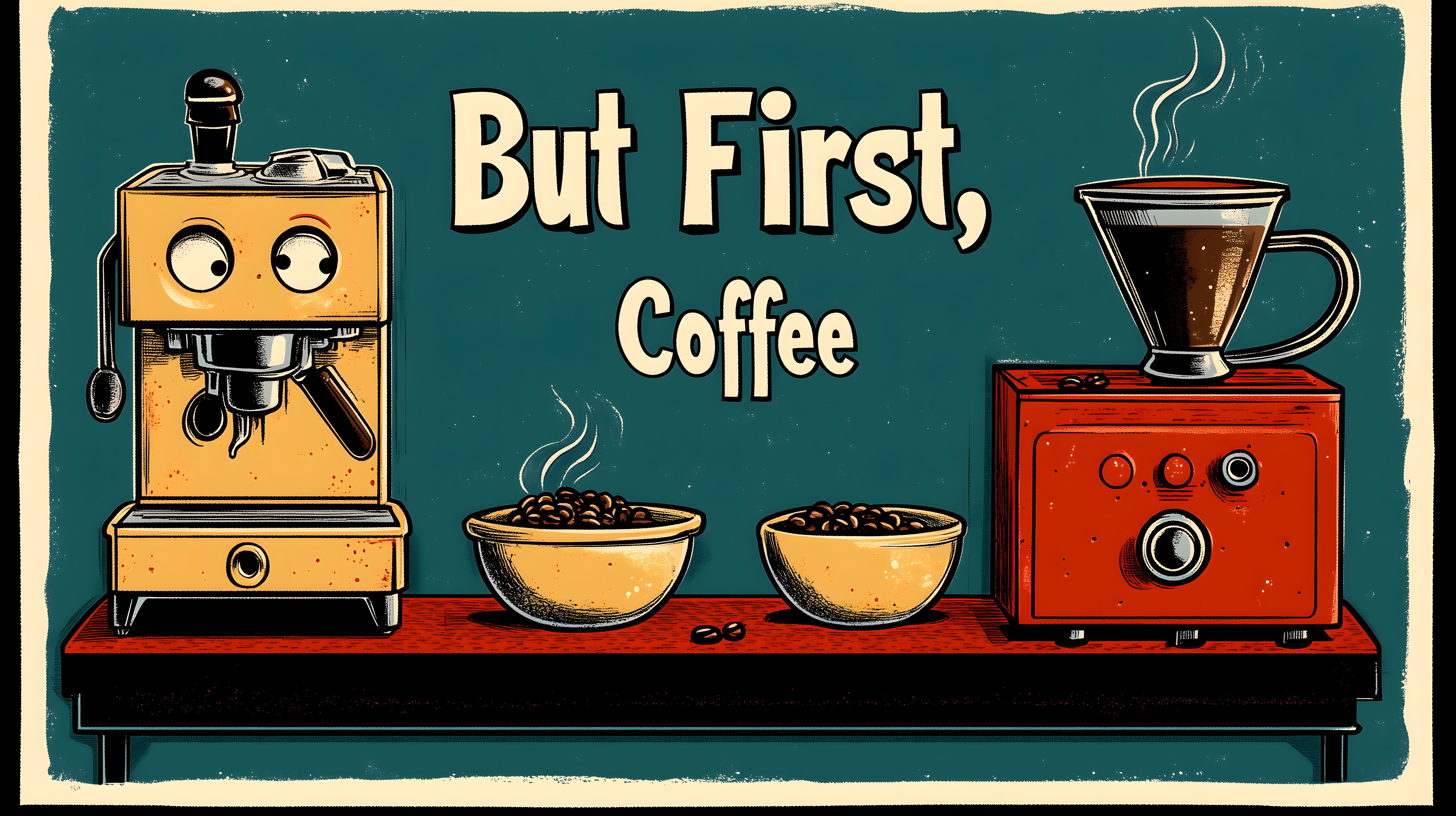 Dieses detaillierte Retro-Poster zeigt eine charmante Zusammenstellung von Kaffeebohnen und Kaffeemaschinen in einem warmen, vintage-inspirierten Farbschema. Die handgezeichnete Illustration im Retro-Stil vermittelt eine nostalgische und gemütliche Atmosphäre, die perfekt für Cafés, Röstereien oder Produktwerbung geeignet ist. Das hochauflösende, kostenlose Stockfoto kann unter Creative-Commons-Lizenz für diverse Anwendungen wie Blogs, Social-Media-Beiträge oder Werbekampagnen genutzt werden.