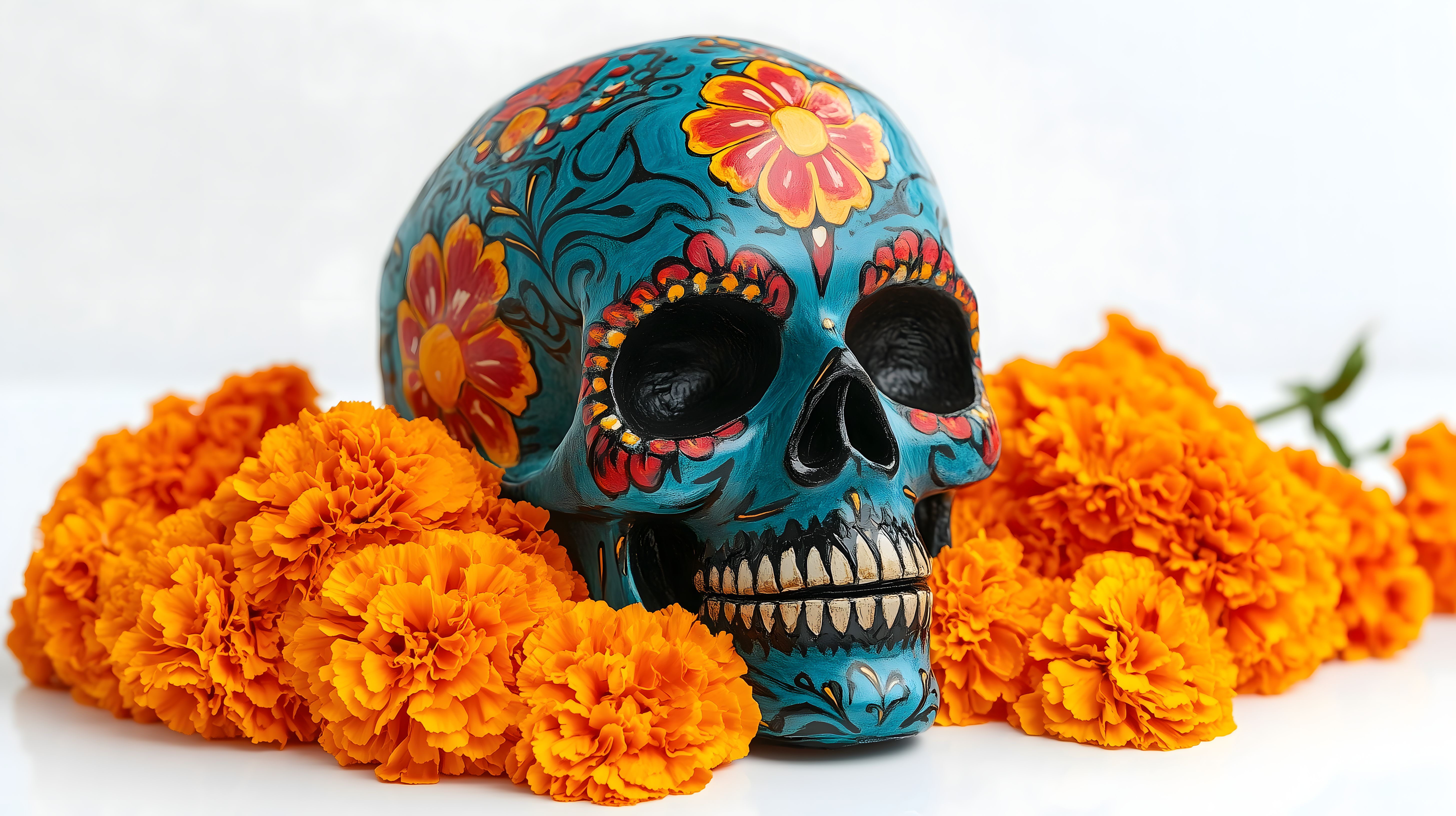 Dieses farbenprächtige Foto zeigt einen traditionellen mexikanischen Totenkopf, auch Calavera genannt, der typischerweise am Tag der Toten, dem Día de los Muertos, verwendet wird. Der Schädel ist in leuchtenden Blautönen gehalten und mit detaillierten, bunten Blumenmotiven verziert. Umgeben ist er von strahlend orangefarbenen Ringelblumen, die das Herbstliche und Festliche dieser Tradition unterstreichen. Das Bild strahlt eine lebendige, kreative und folkloristische Atmosphäre aus und eignet sich hervorragend als Illustration für Beiträge zu mexikanischer Kultur, Traditionen und Feiertagen wie Halloween oder Allerheiligen. Als kostenloses Hochauflösungs-Stockfoto unter einer Creative-Commons-Lizenz ist es vielseitig einsetzbar, z.B. in Blogs, Newslettern oder Social-Media-Beiträgen.