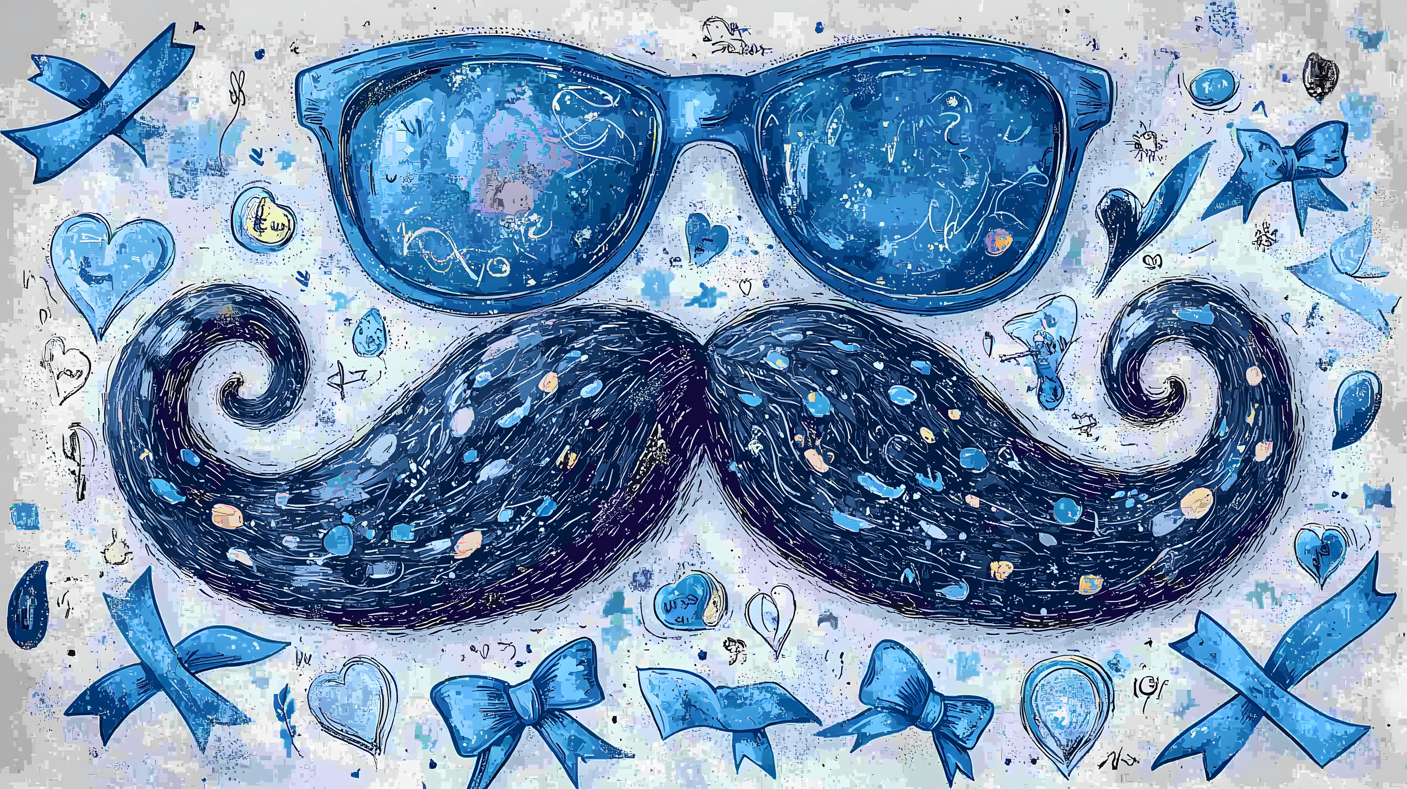 Dieses kunstvoll gestaltete Foto zeigt eine bunte Movember-Illustration. Im Zentrum befindet sich ein detailliert gemalter Schnurrbart in dunklen Blautönen, der von Spritzern und Farbschlieren umgeben ist. Darum herum sind verschiedene blaue grafische Elemente wie Herzen, Schleifen und Wellen angeordnet, die dem Bild einen verspielten und kreativen Charakter verleihen. Die Farbpalette in Blautönen und die Verwendung von Spritzeffekten erzeugen eine dynamische, lebendige Stimmung.