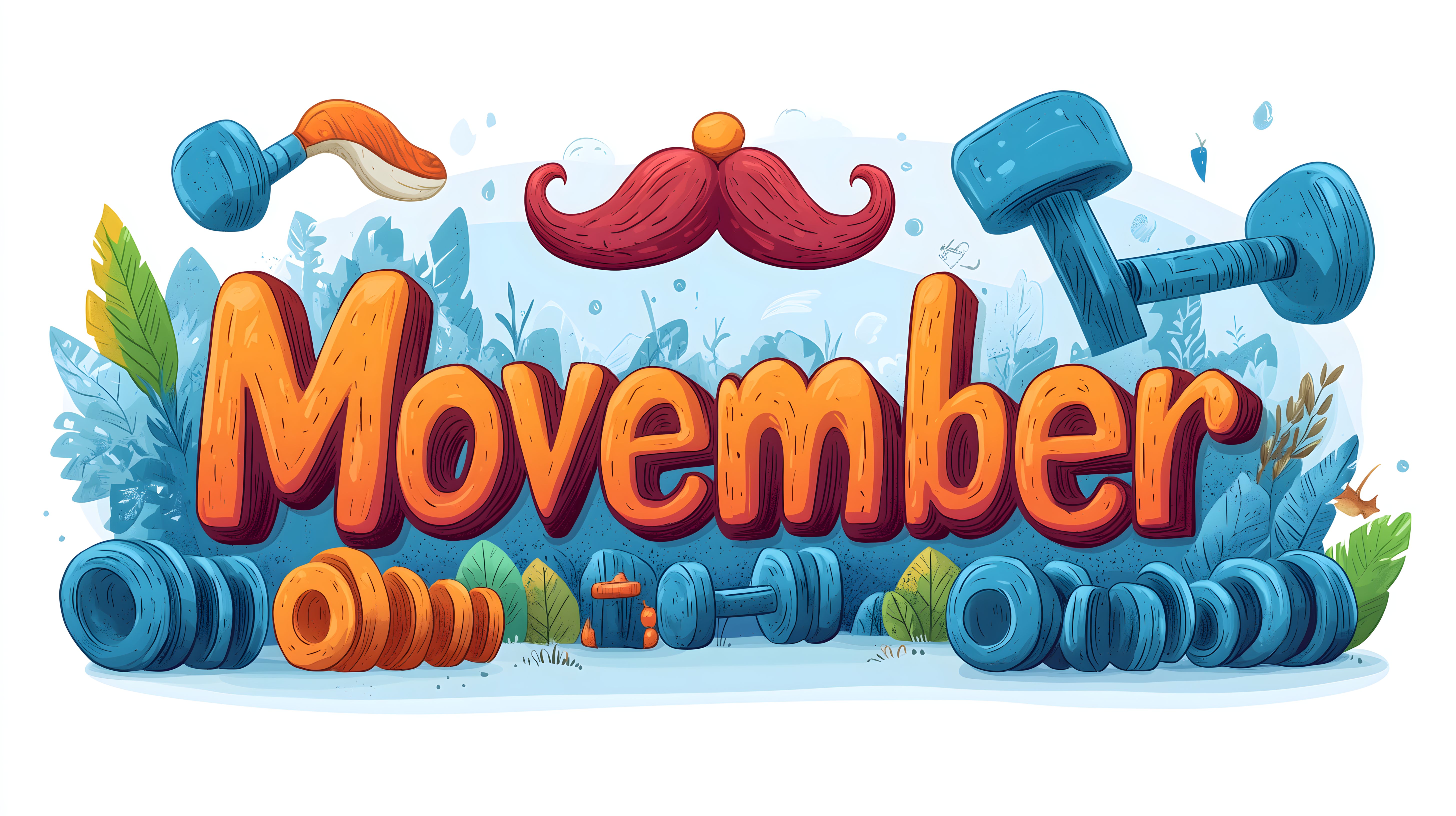 Die farbenfrohe Illustration zeigt eine lebendige und motivierende Darstellung des Movember-Themas. Im Mittelpunkt steht ein markanter, roter Schnurrbart, umgeben von verschiedenen Fitnesselementen wie Hanteln und Gewichten. Die Komposition ist dynamisch und voller Energie, wobei die kräftigen Farben und organischen Formen eine positive und inspirierende Stimmung vermitteln. Diese Gestaltung eignet sich hervorragend für den Einsatz in Blogs, Newslettern, Social-Media-Kanälen oder Werbematerialien rund um das Thema Fitness, Gesundheit und Männergesundheit. Das Bild ist als hochauflösendes, kostenloses Stockfoto unter einer Creative-Commons-Lizenz verfügbar.