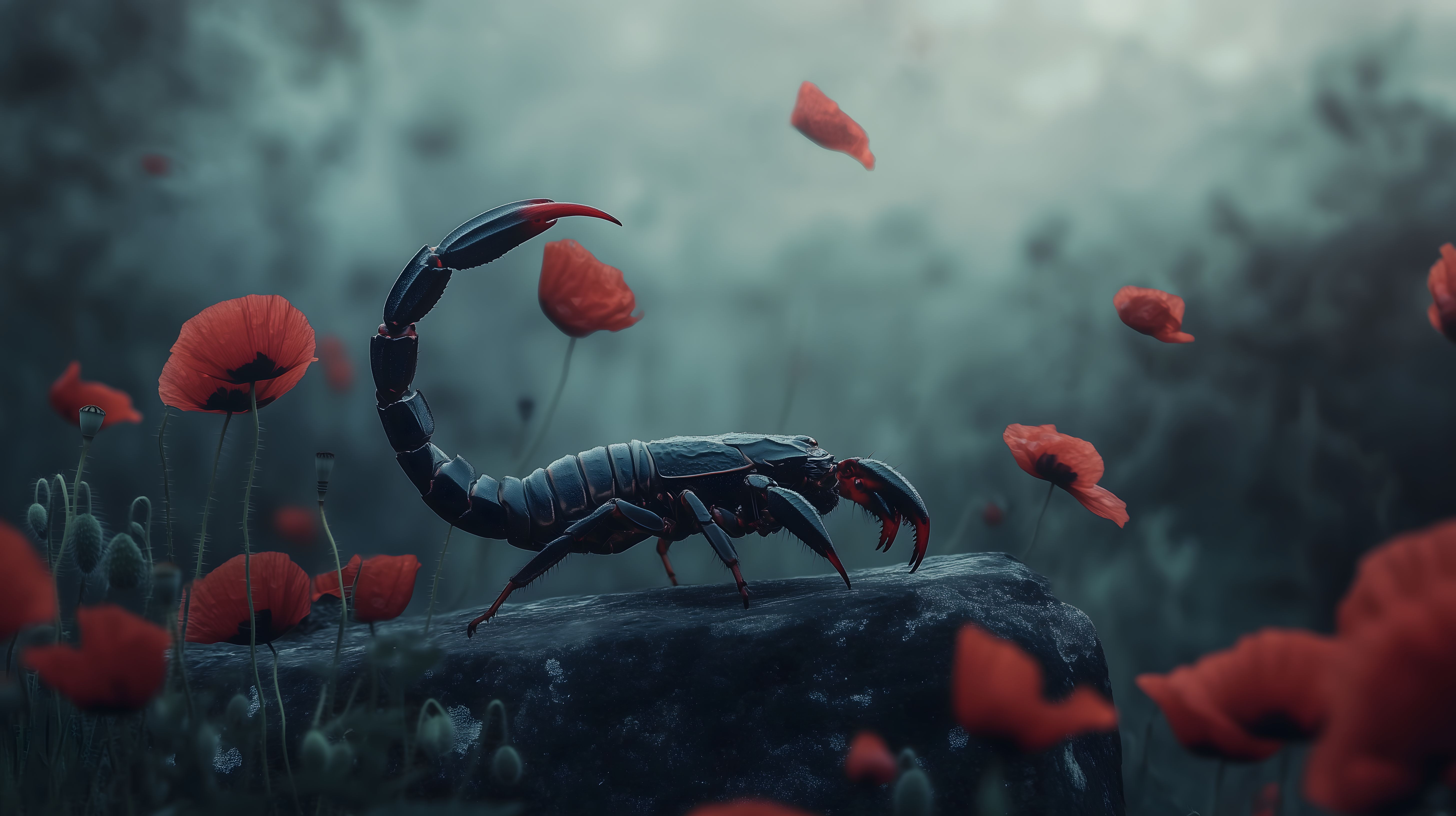 Dieses faszinierende Foto zeigt eine mystische Begegnung mit einem Skorpion inmitten eines Feldes voller Mohnblüten. Die Szenerie ist in ein stimmungsvolles, düsteres Licht getaucht, das dem Bild eine geheimnisvolle Atmosphäre verleiht. Der Skorpion, mit seinen bedrohlichen Zangen, thront majestätisch auf einem Felsen, umgeben von den roten Blüten, die wie Tropfen Blut in der Dämmerung schimmern. Das Bild bietet ein fesselndes Kontraspiel von Dunkelheit und Farbe, Bedrohung und Schönheit. Es eignet sich hervorragend für den Einsatz in Blogs, Newslettern, Social-Media-Beiträgen oder Werbekampagnen, die eine mystische, natürliche oder düstere Stimmung transportieren möchten. Dieses hochauflösende Stockfoto steht unter einer Creative-Commons-Lizenz zur freien Verwendung zur Verfügung.
