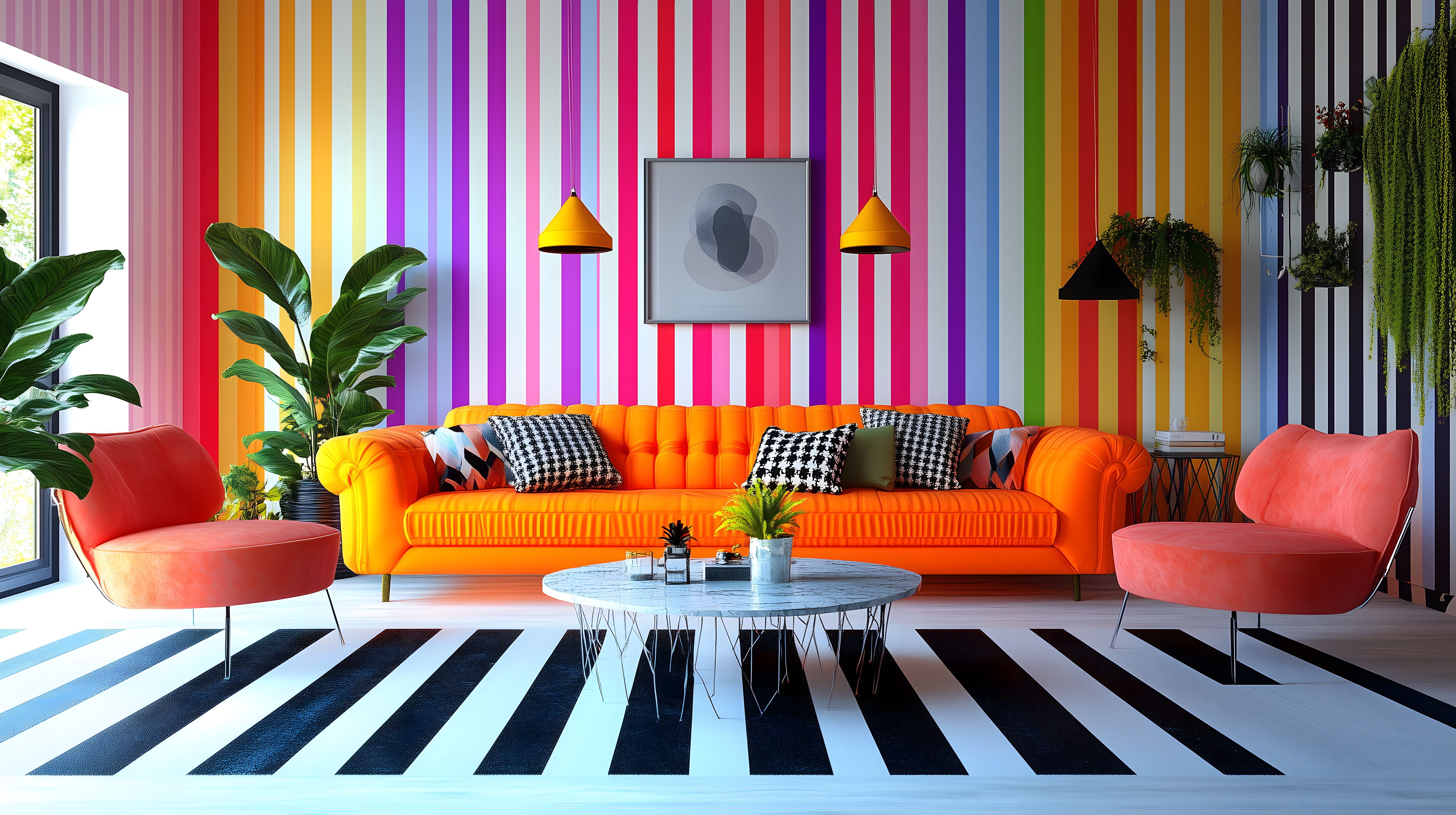 Das Foto zeigt ein knallbuntes, modern eingerichtetes Wohnzimmer mit einer farbenfrohen, gestreiften Tapete an den Wänden. Der Raum wirkt großzügig und einladend. In der Mitte steht ein runder Couchtisch auf einem schwarz-weißen Teppich, umgeben von einer orangefarbenen Eckcouch und zwei pinken Sesseln. An den Wänden hängen eine Wanddekoration und zwei gelbe Lampen, die für Akzente sorgen. Potente Zimmerpflanzen runden das Bild ab und verleihen dem Raum eine natürliche Note. Insgesamt strahlt das Wohnzimmer eine kreative, fröhliche und moderne Atmosphäre aus. Dieses bunte Stockfoto in hoher Auflösung eignet sich optimal für den Einsatz in Blogs, Newslettern oder Werbematerialien unter einer Creative-Commons-Lizenz.