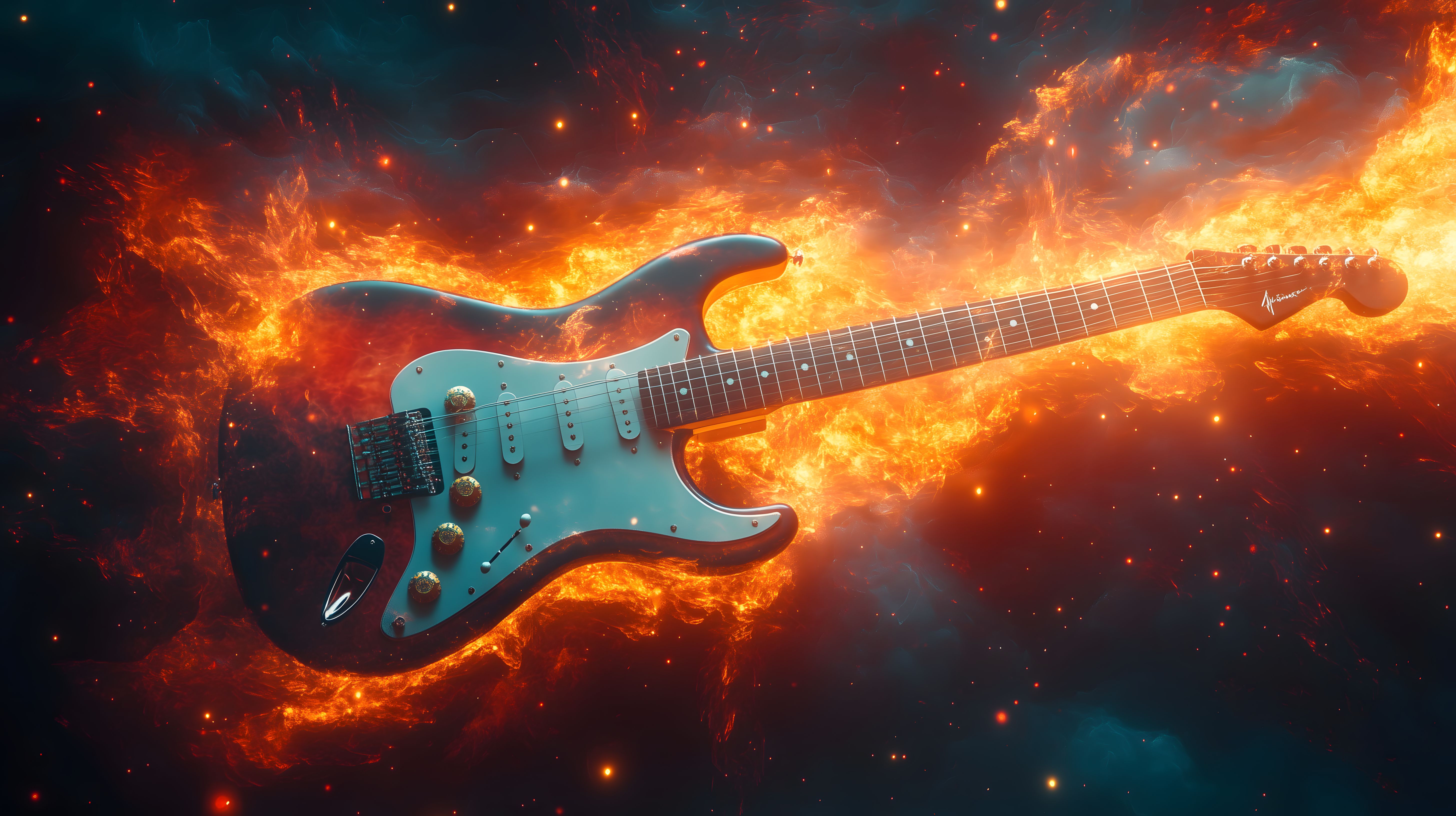 Diese beeindruckende Illustration zeigt eine elektrische Gitarre vor einer feurigen, kosmischen Kulisse. Das Instrument ist detailliert dargestellt, mit leuchtenden Farben und funkelnden Reflexionen. Der Hintergrund ist in einer dramatischen, surrealen Ästhetik gehalten, mit lodernden Flammen, Sternhaufen und Nebelformationen, die eine kraftvolle, energiegeladene Stimmung erzeugen.