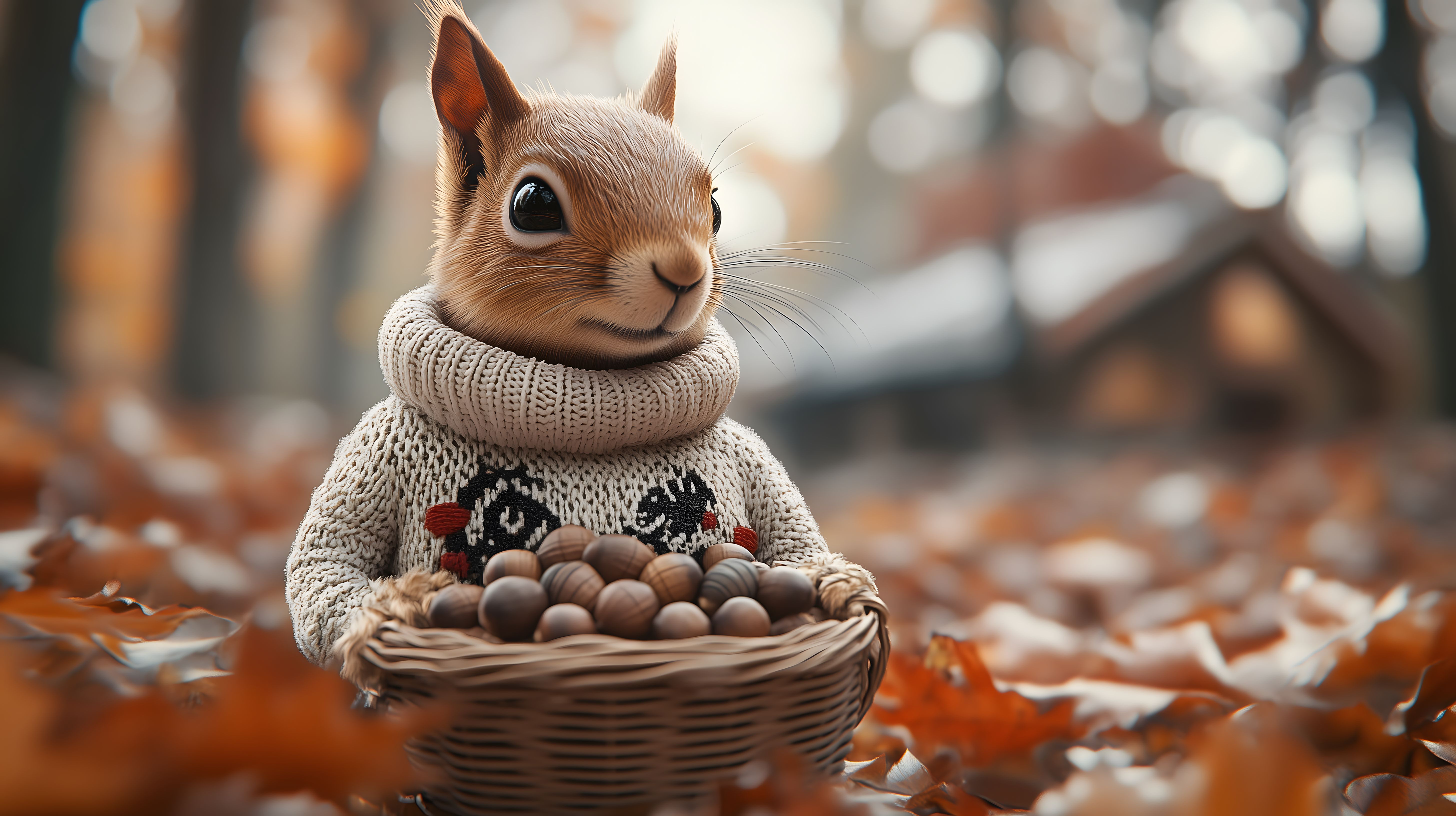Das Bild zeigt ein niedliches Eichhörnchen, das in einem herbstlichen Wald sitzt und einen Korb voller Haselnüsse hält. Das Tier ist in einen gemütlichen Strickpullover gehüllt, was den Eindruck einer kuscheligen Szene verstärkt. Die natürlichen Farben und die verschwommene Umgebung verleihen dem Foto eine stimmungsvolle, gemütliche Atmosphäre.