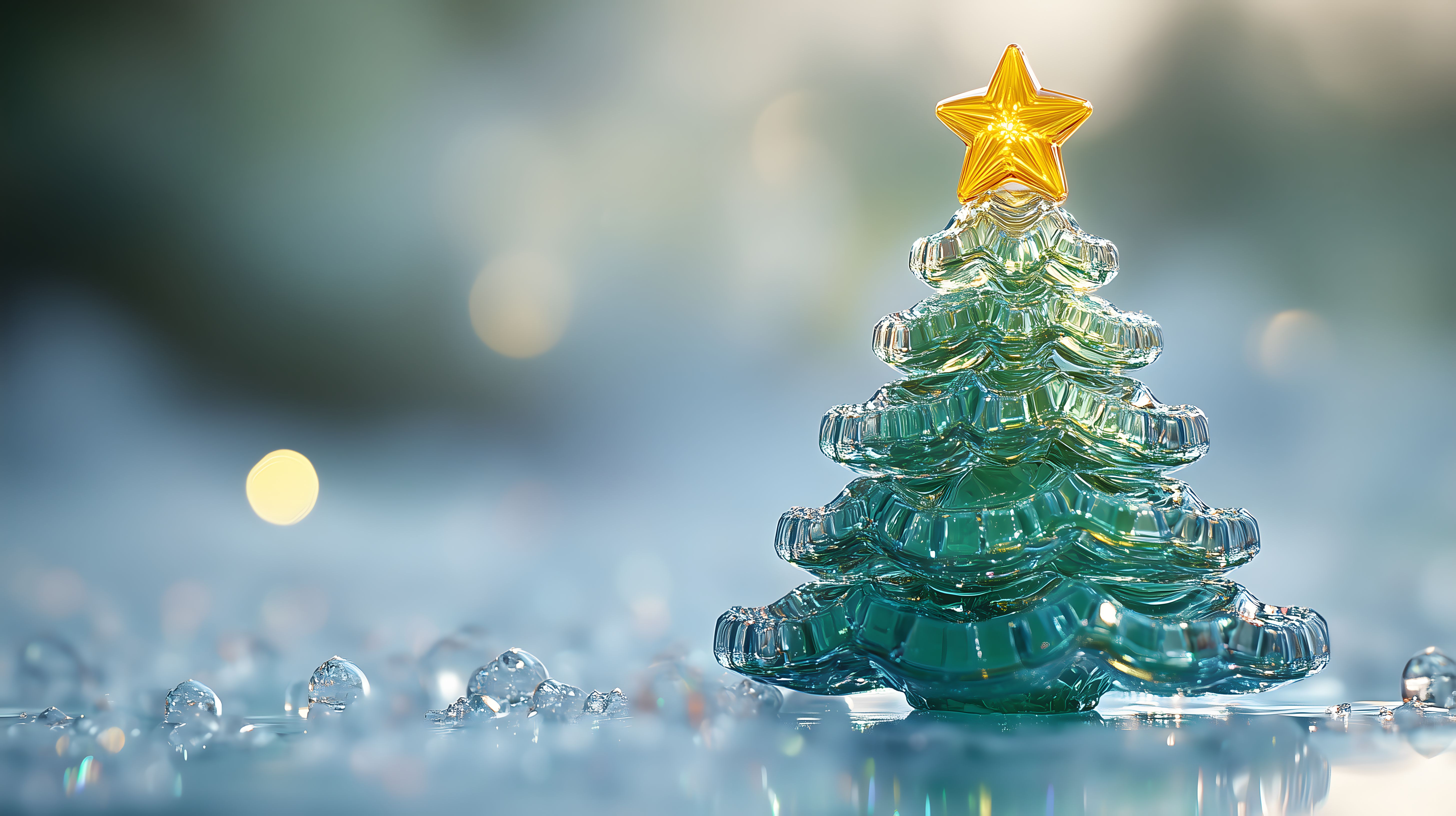 Das Bild zeigt einen transparenten, gläsernen Weihnachtsbaum mit einem goldfarbenen Stern an der Spitze, der auf einer glitzernden, eisigen Oberfläche steht. Der Baum hat eine moderne, minimalistisch-elegante Optik und hebt sich durch seine Durchsichtigkeit vom traditionellen, geschmückten Weihnachtsbaum ab. Die Szene vermittelt eine kühle, winterliche Stimmung, die durch die Beleuchtung und den verschwommenen Hintergrund verstärkt wird. Dieses Stockfoto ist in hoher Auflösung verfügbar und kann für verschiedene Zwecke wie Blogs, Newsletter, Social-Media-Posts oder Werbematerial kostenlos verwendet werden. Es ist unter einer Creative-Commons-Lizenz lizenziert.