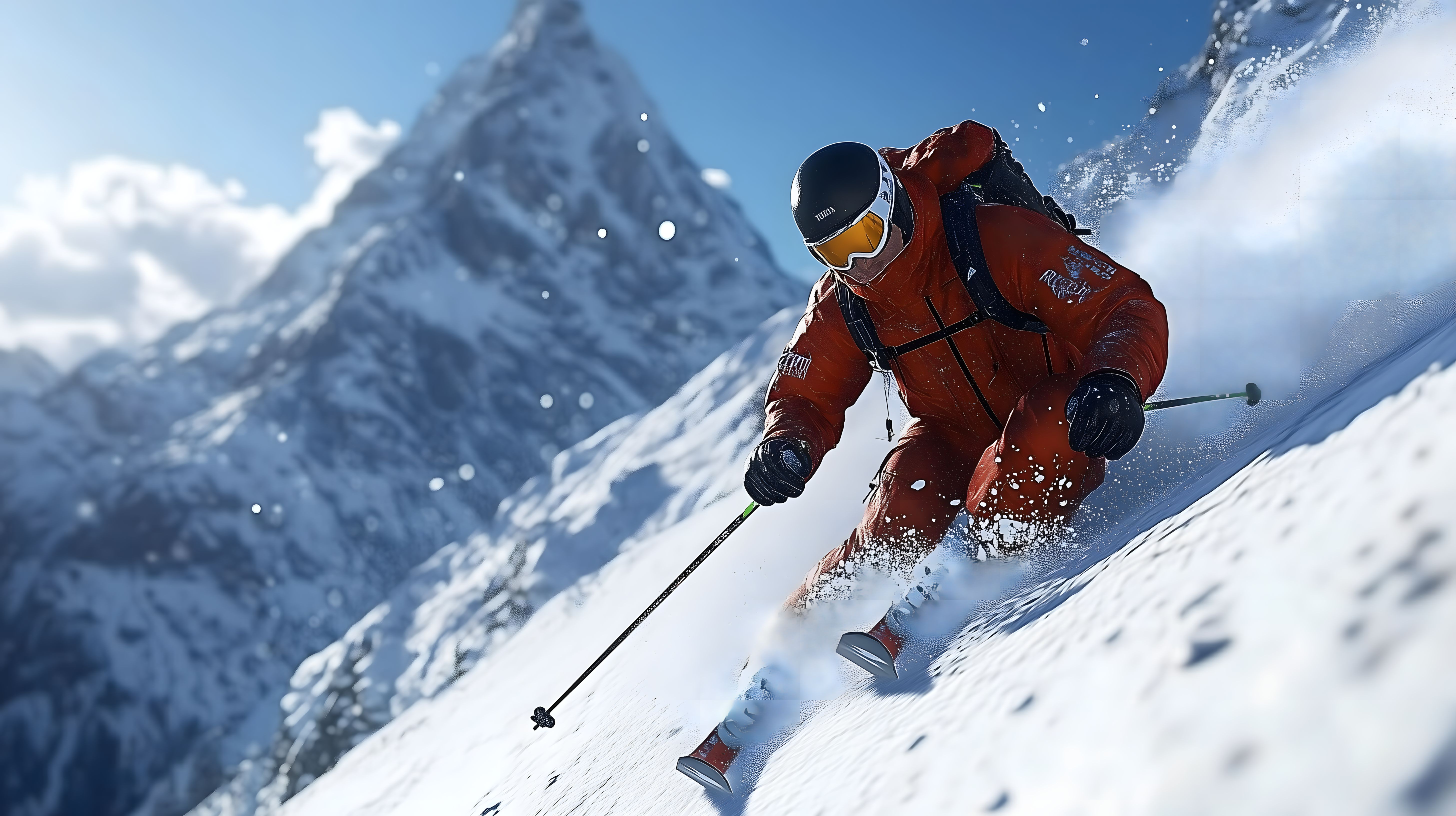Das Bild zeigt einen Skifahrer, der mit hoher Geschwindigkeit einen schneebedeckten Berghang hinunterfährt. Der Skifahrer ist in leuchtend roter Skibekleidung gekleidet und trägt eine Schutzbrille. Der Hintergrund ist geprägt von majestätischen Bergen, die in der Ferne zu sehen sind, sowie von Wolken am Himmel. Die Komposition des Bildes unterstreicht die Dynamik und Bewegung des Skifahrers, der scheinbar durch den Schnee pflügt. Dieses Foto eignet sich hervorragend für die Verwendung in Blogs, Newslettern, Social-Media-Beiträgen oder Werbematerialien rund um Wintersport, Abenteuer und Outdoor-Aktivitäten. Das hochauflösende Bild steht unter einer kostenlosen Creative-Commons-Lizenz zur Verfügung.