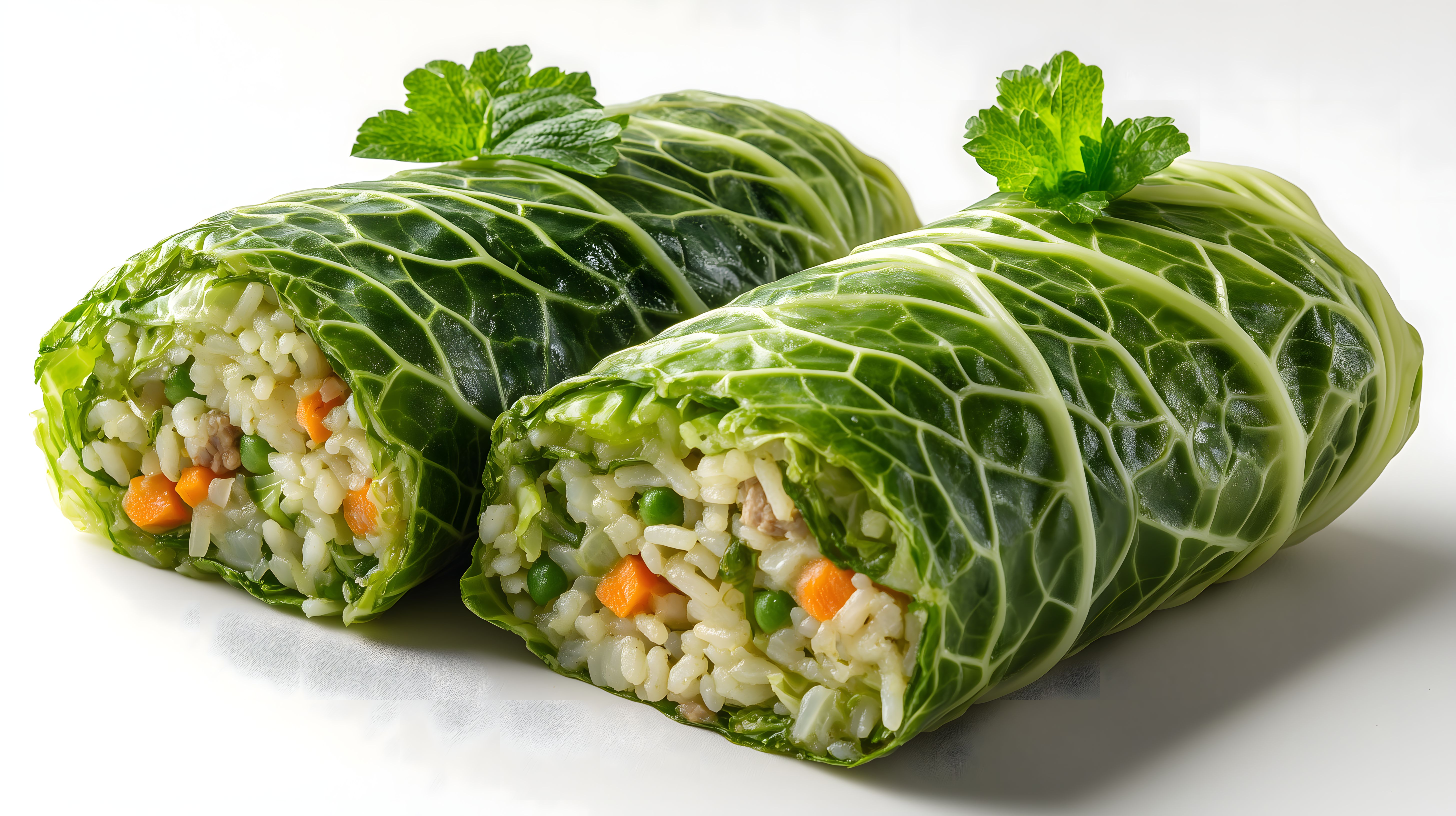 Dieses köstliche Foto zeigt frisch zubereitete vegane Kohlrouladen, gefüllt mit Reis und knackigem Gemüse wie Karotten und Erbsen. Die saftig-grünen Kohlblätter umhüllen den leckeren Inhalt und verleihen dem Gericht eine schöne, rustikale Optik. Das Bild besticht durch seine satte Farbpalette von Grün- und Orangetönen sowie die appetitliche Anordnung der Zutaten. Es eignet sich hervorragend als Werbefoto für gesunde Ernährung, Kochrezepte oder als Deko-Element in Lifestyle-Blogs und Social-Media-Posts. Als hochwertiges Stockfoto in hoher Auflösung und unter Creative-Commons-Lizenz bietet es vielfältige Einsatzmöglichkeiten.