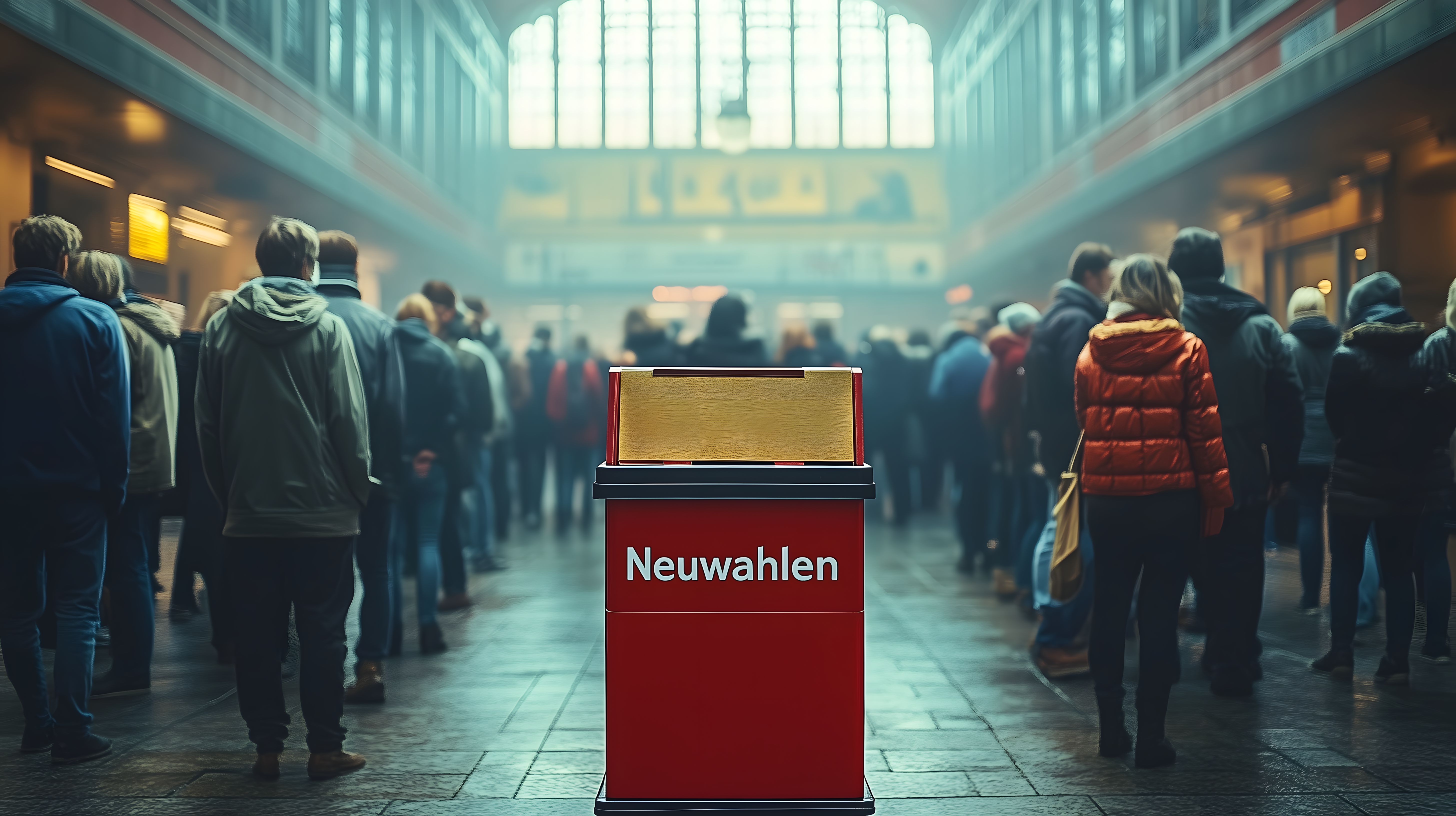 Das Foto zeigt eine rote Wahlurne in einem belebten Bahnhofsgebäude. Im Hintergrund ist eine Menschenmenge zu sehen, die sich durch die hoch aufragenden Glasfronten des historischen Gebäudes bewegt. Die Urne steht inmitten dieses geschäftigen Treibens und symbolisiert den demokratischen Prozess der Wahlen. Das Bild vermittelt Atmosphäre und Spannung und könnte für Berichte, Infografiken oder Werbematerial rund um das Thema Politik und Demokratie eingesetzt werden. Als hochwertiges, kostenloses Stockfoto in lizenzfreier Creative-Commons-Nutzung ist es perfekt für redaktionelle und kommerzielle Zwecke geeignet.