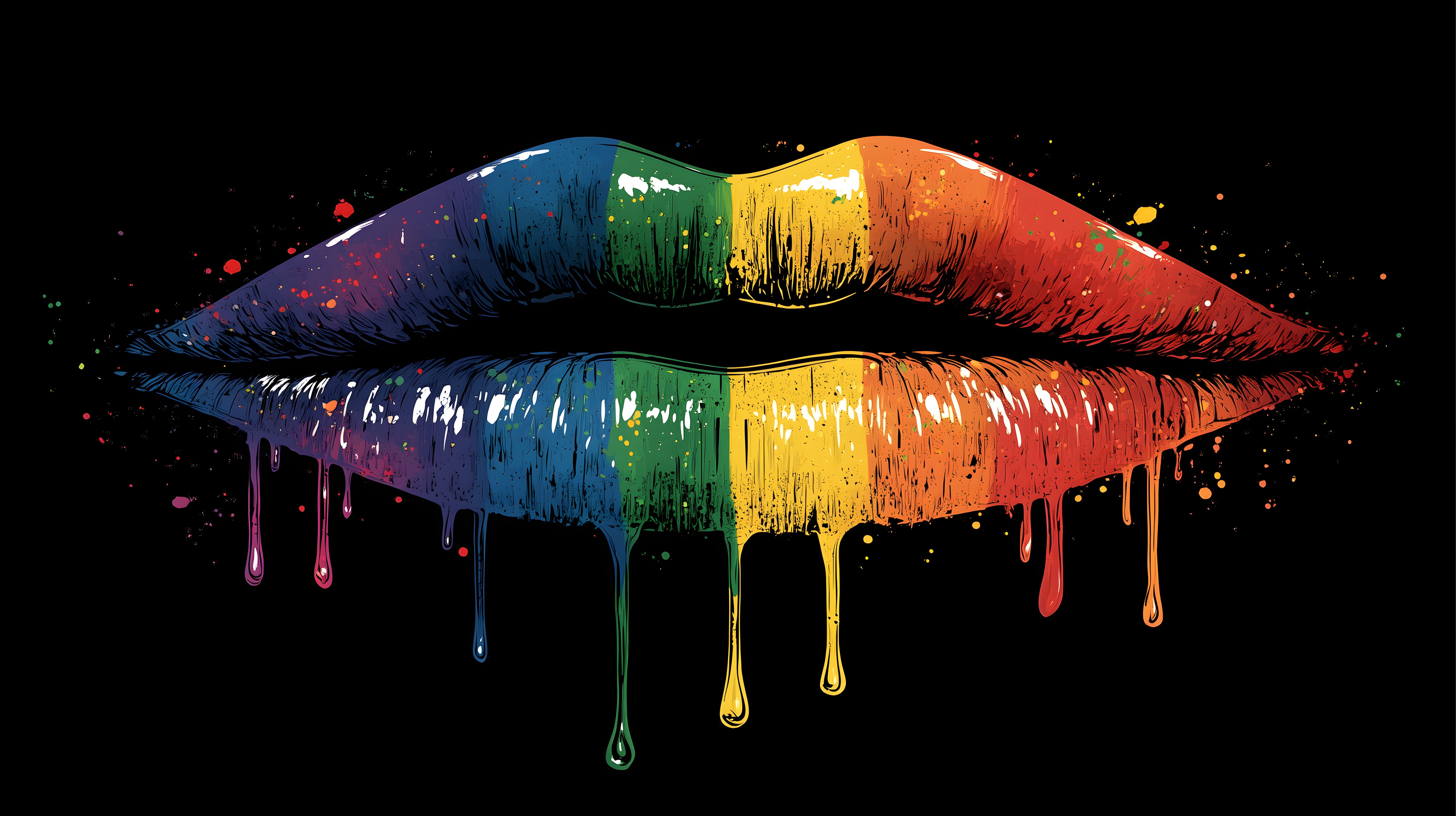 Das Bild zeigt eine abstrakte Grafik von bunten, fließenden Lippen auf schwarzem Hintergrund. Der Farbverlauf erstreckt sich von kräftigem Blau über Grün und Gelb bis hin zu leuchtendem Orange und Rot. Die Farben scheinen ineinander überzugehen und tropfenartig herunterzulaufen, was eine dynamische und lebendige Wirkung erzeugt. Dieses faszinierende Motiv eignet sich hervorragend als kostenloses Stockfoto für eine Vielzahl von Einsatzzwecken, etwa in Blogs, Newslettern oder Werbematerialien in den Bereichen Grafik, Illustration oder digitale Kunst. Das hochauflösende Bild steht unter einer Creative-Commons-Lizenz zur freien Nutzung zur Verfügung.