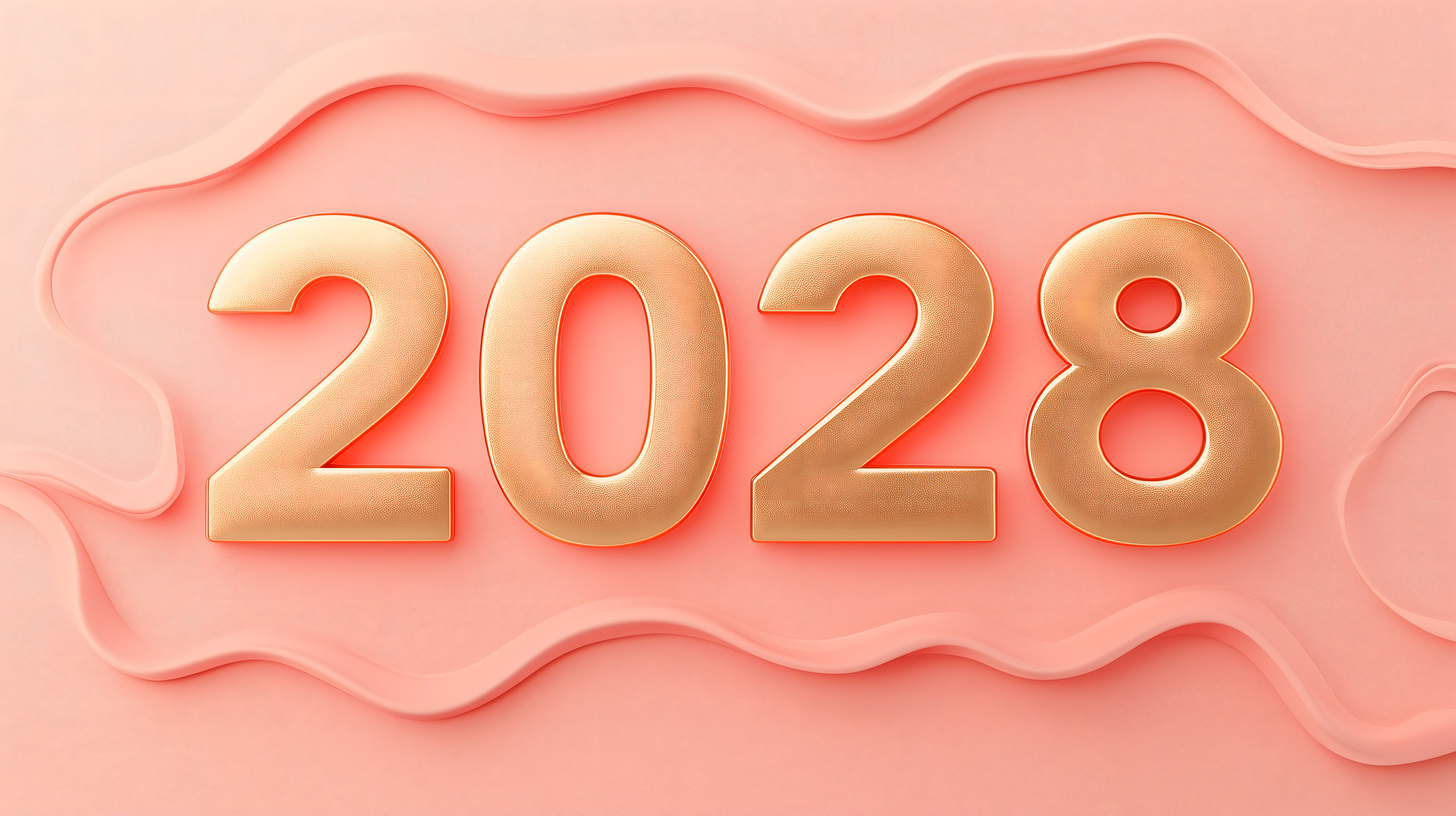 Dieses Bild zeigt eine moderne und elegante Darstellung der Jahreszahl 2028. Die goldenen, dreidimensional wirkenden Ziffern sind vor einem Hintergrund in Coral-Tönen platziert, der durch wellenförmige Strukturen eine fließende, dekorative Optik erhält. Der visuelle Kontrast zwischen den warmen Nuancen und der kühlen, metallischen Schrift erzeugt einen ansprechenden, designorientierten Gesamteindruck.