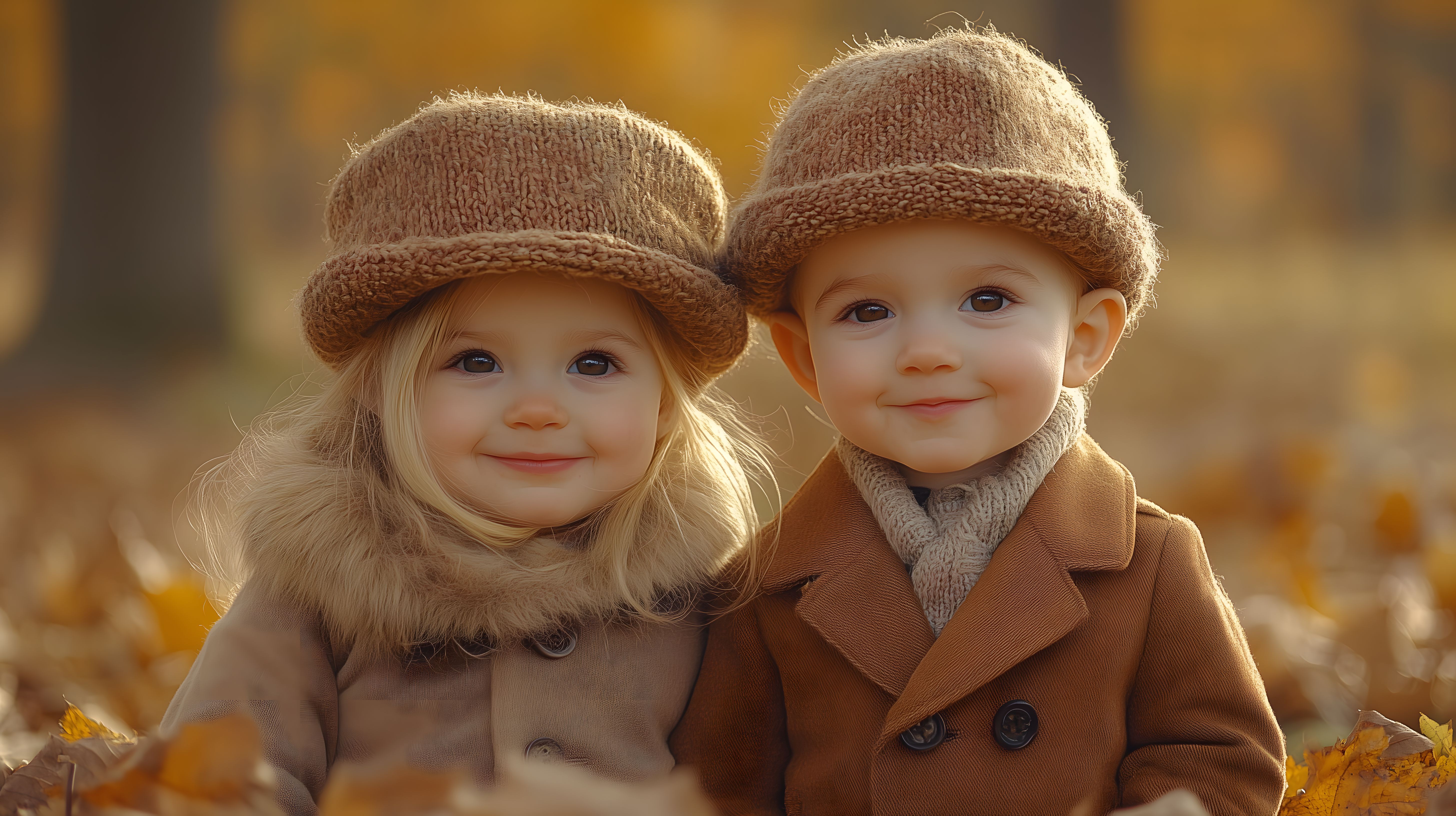 Dieses Foto zeigt zwei Kleinkinder in gemütlichen Herbstoutfits, die fröhlich und voller Lebensfreude in einer herbstlichen Umgebung posieren. Die Kinder tragen warme Jacken, Mützen und Handschuhe und lächeln in die Kamera. Im Hintergrund sieht man bunte Blätter und eine herbstliche Atmosphäre, die eine gemütliche Stimmung vermittelt.