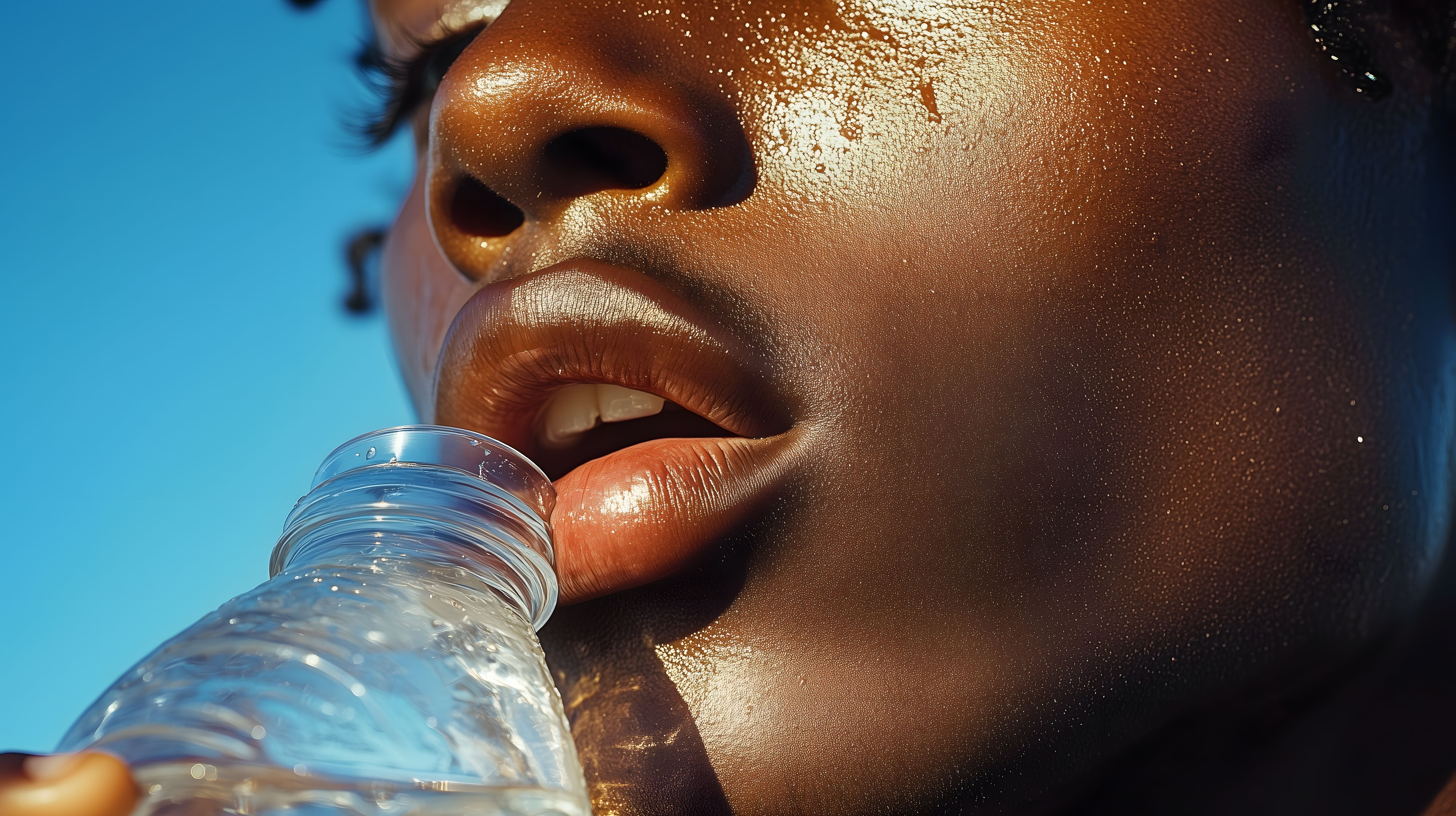 Nahaufnahme einer Frau mit bronzefarbener Haut, die eine Flasche mit klarem Mineralwasser trinkt. Die Perspektive ist direkt auf das Gesicht fokussiert, welches von den Lippen über die Nase bis zu den Augen im Vordergrund steht. Der Hintergrund ist ein sattes, leuchtendes Blau, das den Fokus auf das erfrischende Wasser und den goldenen Glanz der Haut lenkt. Dieses hochauflösende Stockfoto kann ideal für Gesundheits-, Wellness- oder Lifestyle-Themen in Blogs, Newslettern oder sozialen Medien verwendet werden und steht unter der Creative-Commons-Lizenz zur kostenlosen Nutzung zur Verfügung.