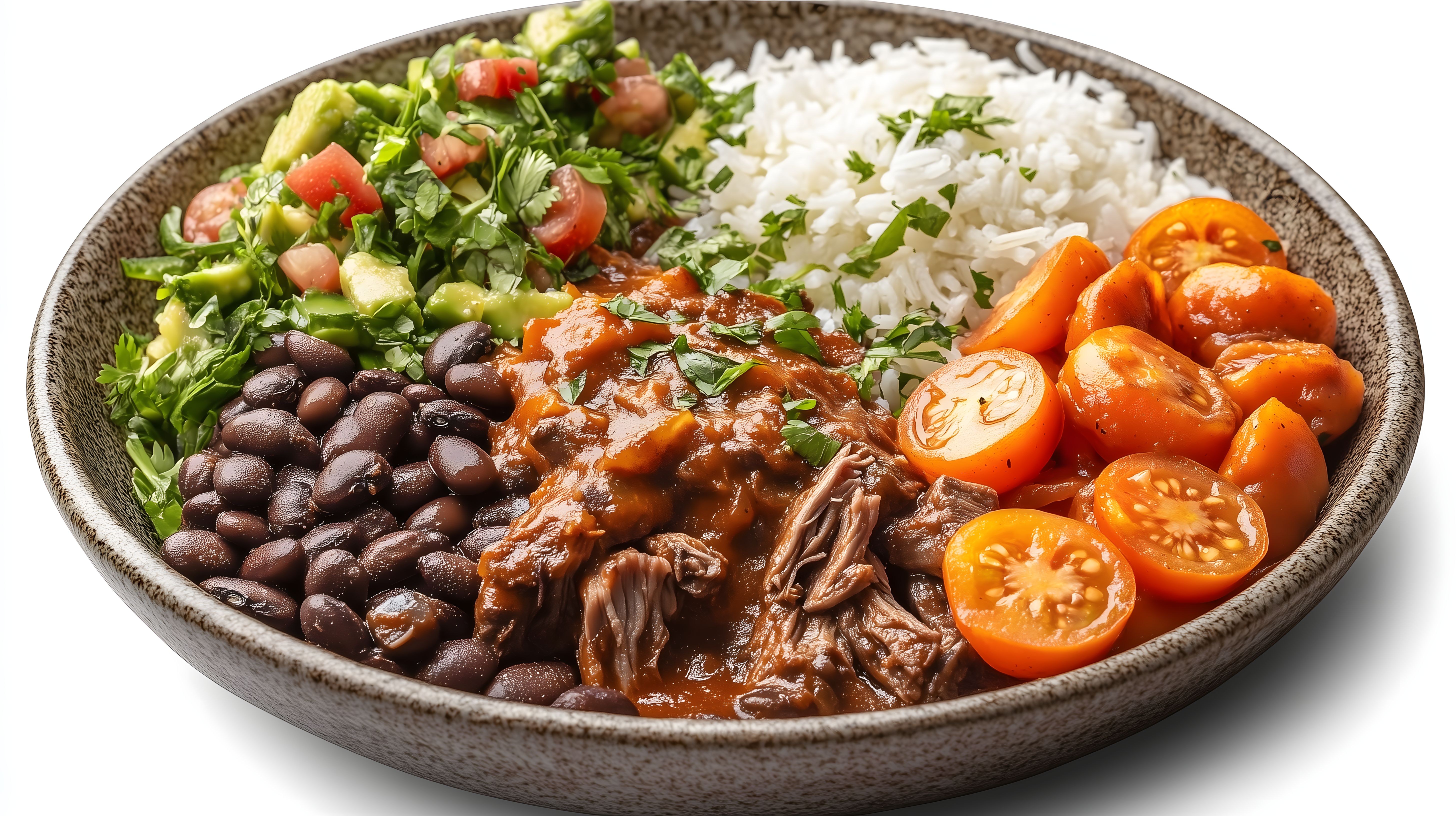 Das Foto zeigt eine appetitlich angerichtete Schüssel mit einem traditionellen mexikanischen Gericht. Im Mittelpunkt steht eine leckere Mischung aus Reis, schwarzen Bohnen und geschmortem Fleisch in einer würzigen Soße. Umgeben ist das Hauptgericht von frisch geschnittenem Gemüse wie Tomaten, Avocado und Kräutern, die dem Gericht eine schöne Farbe und Frische verleihen. Das rustikale Geschirr und die Draufsicht-Perspektive vermitteln ein authentisches, authentisches Flair der mexikanischen Küche. Dieses hochwertige Stockfoto eignet sich hervorragend für Rezeptblogs, Kochbücher, Social-Media-Posts oder Werbematerialien zum Thema gesunde, internationale Ernährung. Das Bild ist in hoher Auflösung verfügbar und unter einer Creative-Commons-Lizenz kostenlos nutzbar.