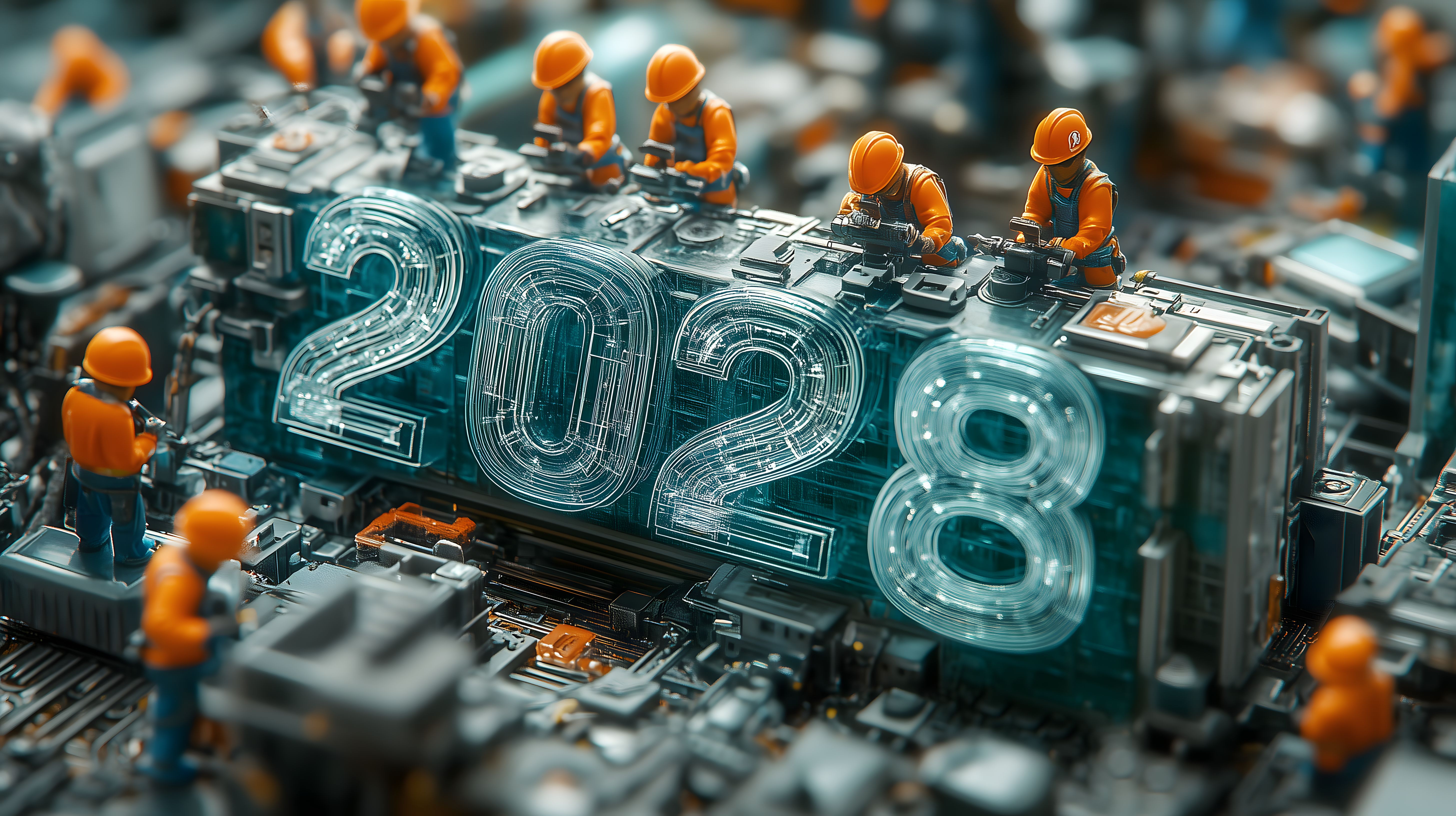 Das Bild zeigt eine futuristische Szene, in der Miniaturarbeiter in orangen Schutzanzügen an der Entwicklung der Zahl 2028 arbeiten. Die Zahl ist in blau-grünen, leuchtenden Konturen dargestellt und hebt sich vom technologischen Hintergrund ab. Die Arbeiter sind in unterschiedlichen Posen abgebildet, was den Eindruck einer dynamischen, kreativen Arbeit vermittelt. Das Bild vermittelt eine Vision der technologischen Entwicklung und Innovation für das Jahr 2028. Es eignet sich hervorragend als kostenloses Stockfoto für Artikel, Blogs oder Social-Media-Beiträge zu Themen wie Zukunft, Digitalisierung, Hightech-Industrie oder technologischen Fortschritt. Die hohe Auflösung und die Creative-Commons-Lizenz ermöglichen eine vielfältige Nutzung.