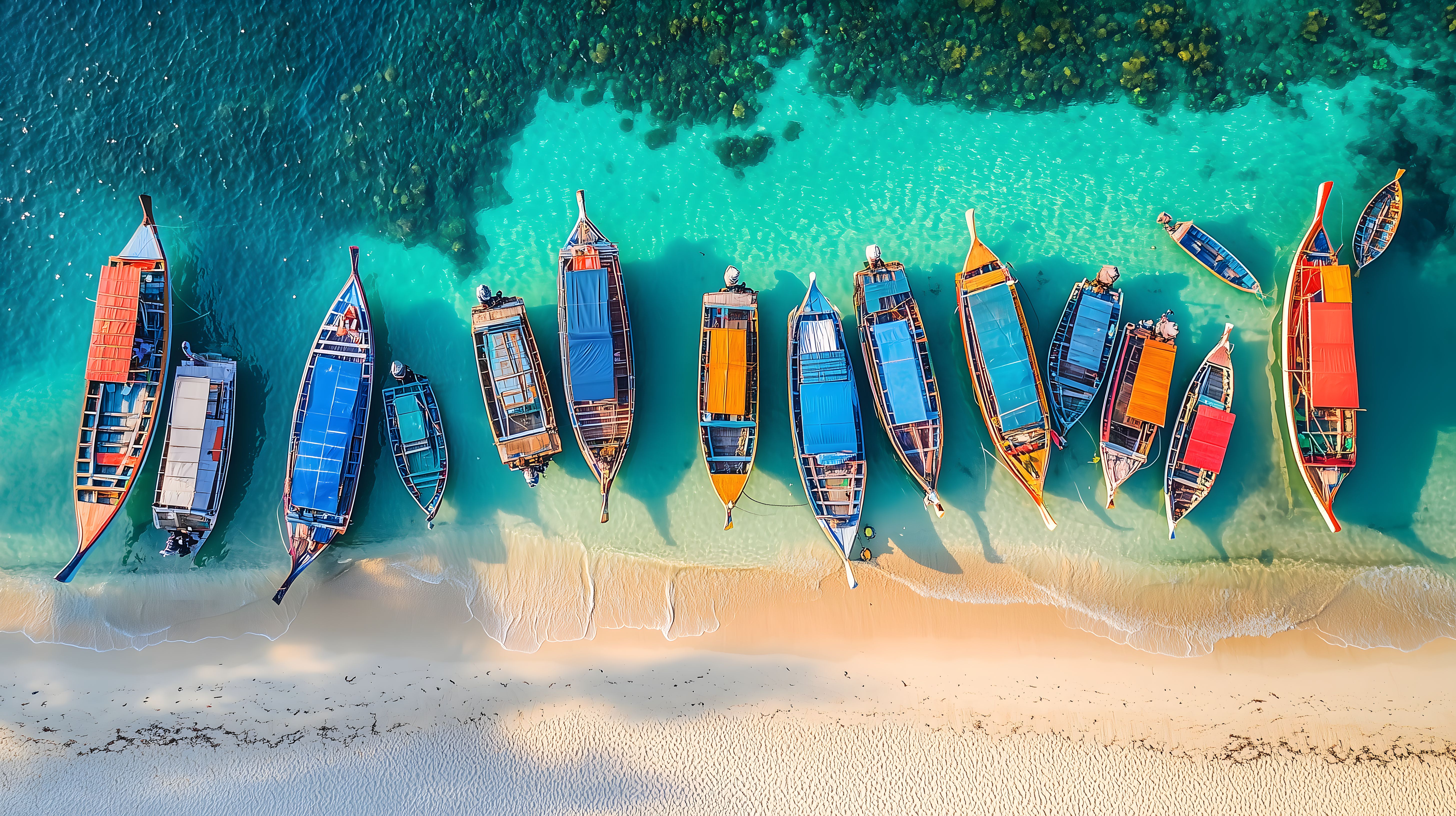 Diese wundervolle Luftaufnahme zeigt eine Reihe farbenfroher Boote, die friedlich auf dem türkisfarbenen Wasser vor einem tropischen Strand treiben. Die Perspektive aus der Vogelperspektive gibt dem Bild eine einzigartige Ästhetik und lässt die Details der Boote sowie die Schönheit der Umgebung eindrucksvoll hervortreten. Dieses hochauflösende Foto bietet vielfältige Einsatzmöglichkeiten, etwa für Blogs, Newsletter, Social-Media-Posts oder Werbematerialien zum Thema Reisen, Urlaub und Entspannung. Als kostenloses Stockfoto unter Creative-Commons-Lizenz ist es frei verwendbar.