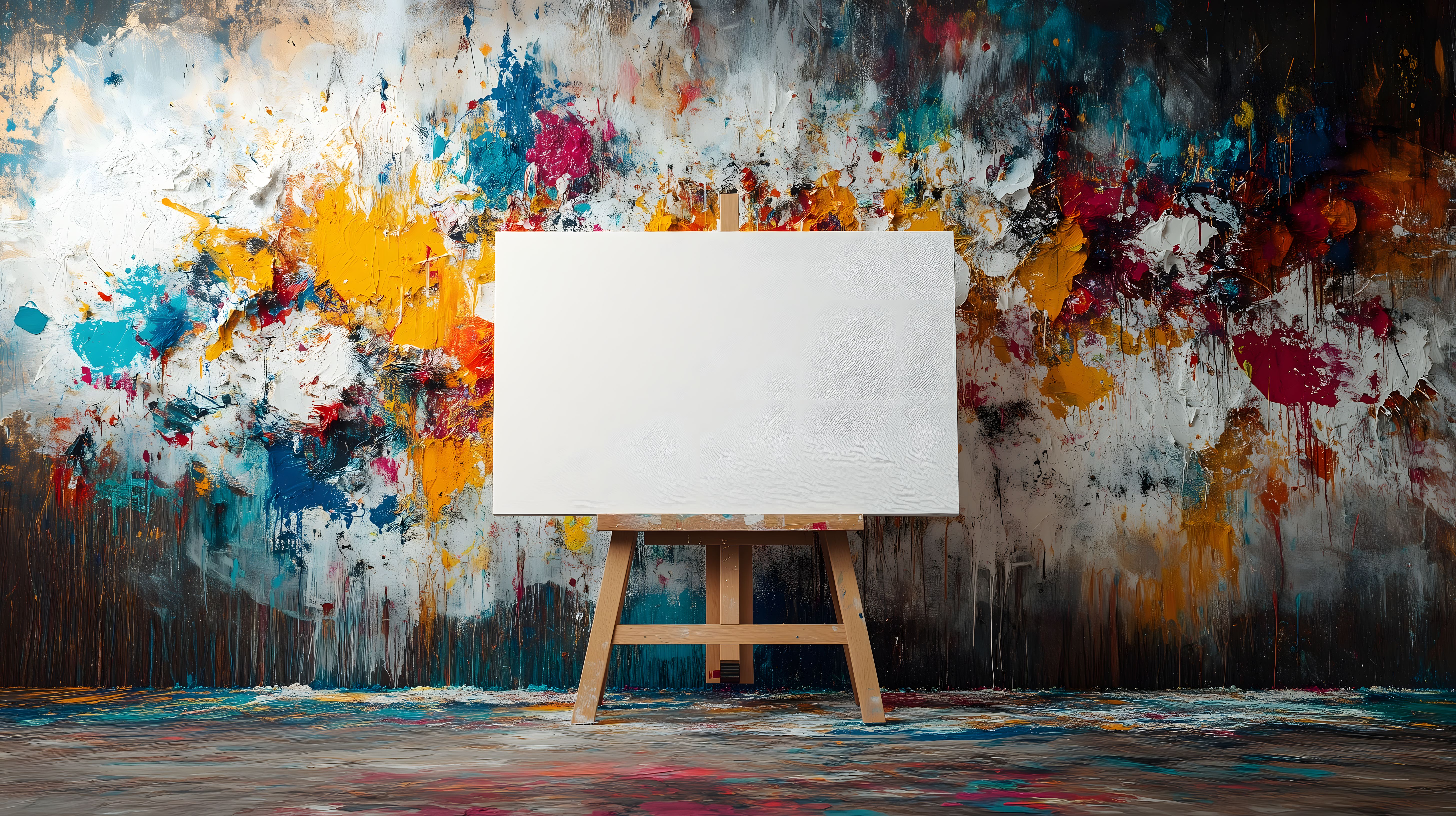Dieses farbenfrohe, abstrakte Gemälde zeigt eine dynamische Komposition aus verschiedensten Farbspritzern und -verläufen. Die Leinwand ist auf einer Staffelei platziert und vor einem eindrucksvollen, vielfarbigen Hintergrund positioniert, der die Energie und Kreativität des Kunstwerks unterstreicht. Dieses Bild eignet sich hervorragend als stimmungsvoller Hintergrund für Websites, Social-Media-Beiträge, Werbematerialien oder Blogeinträge, die einen künstlerischen, inspirierenden Charakter vermitteln möchten. Das hochauflösende Foto steht unter einer Creative-Commons-Lizenz zur kostenlosen Verwendung zur Verfügung.