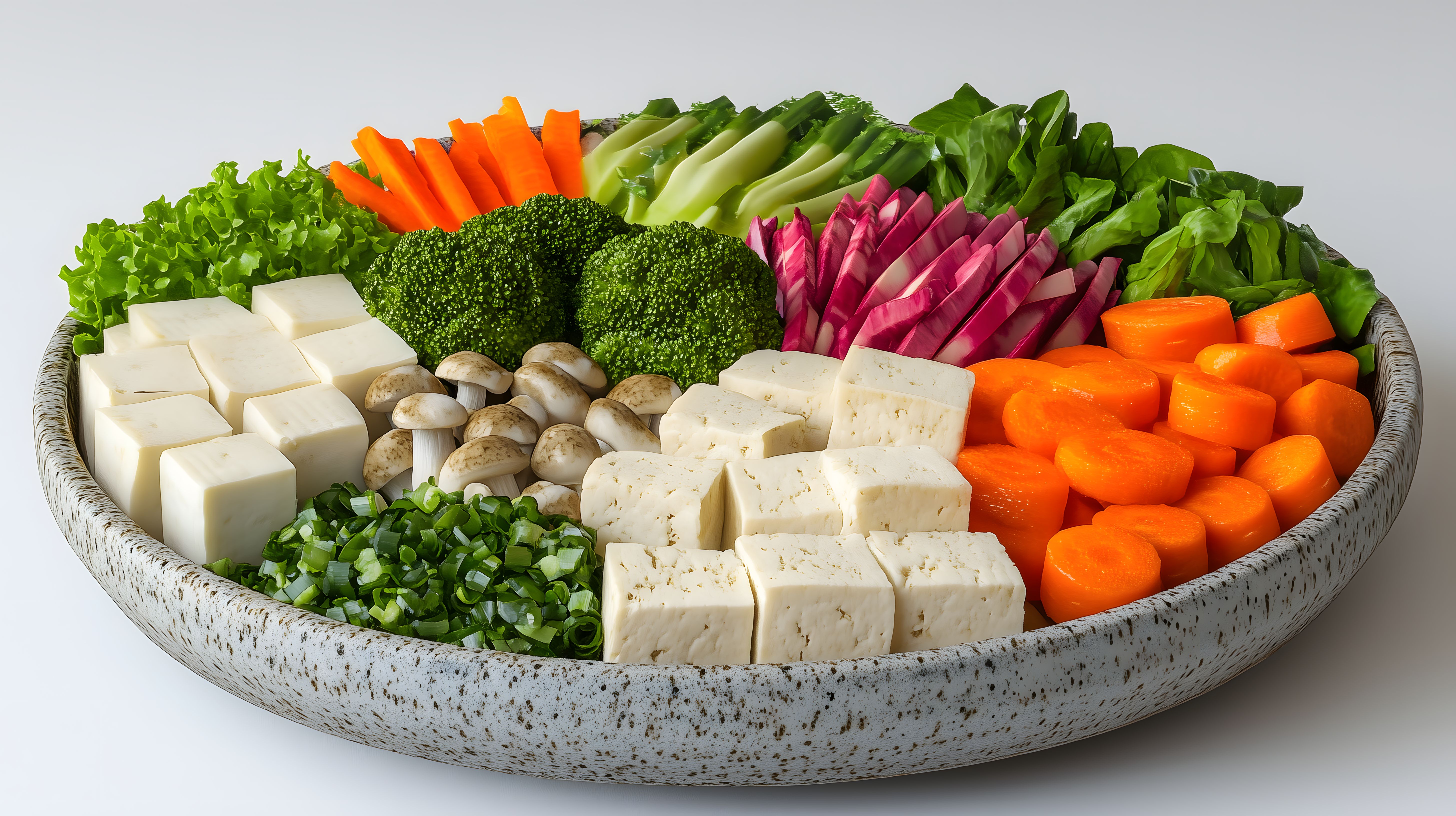 Das Bild zeigt eine bunte Auswahl an frischem Gemüse und Tofu auf einem Holzteller angeordnet. Die Zutaten wie Brokkoli, Karotten, Radieschen, verschiedene Grüns und Pilze sind in einem appetitlichen Arrangement präsentiert. Die Farbpalette reicht von kräftigem Grün über Orange bis zu Rot und Weiß. Das natürliche, rustikale Setting lässt vermuten, dass es sich um ein hochwertiges, kostenloses Stockfoto in hoher Auflösung handelt, das sich perfekt für Rezepte, Kochblogs, Newsletter oder Werbekampagnen rund um gesunde, vegetarische oder vegane Ernährung eignet. Dieses Bild strahlt Frische, Natürlichkeit und Wohlbefinden aus.