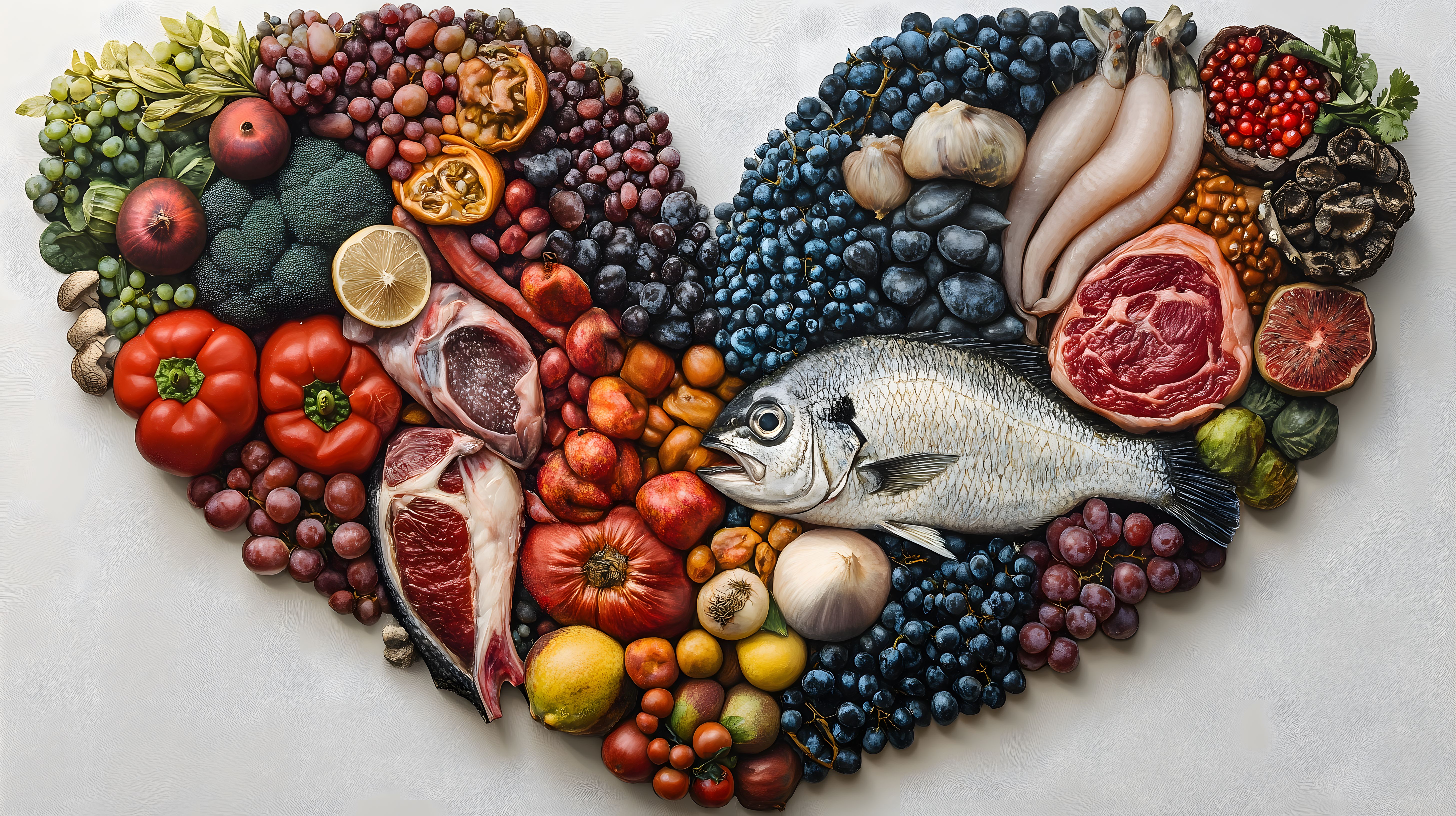 Dieses stimmungsvolle Foto zeigt eine kreisförmige Anordnung von frischen Lebensmitteln in Herzform. Die Komposition umfasst eine Vielzahl von Obst, Gemüse, Meeresfrüchten und Fleisch in satten Farben von Rot, Blau und Gelb. Das Bild strahlt Frische, Natürlichkeit und Gesundheit aus und eignet sich hervorragend als hochwertiges Stockfoto für Blogs, Social Media-Beiträge oder Werbekampagnen zum Thema Ernährung, Kochen und Lebensmittel. Das Foto ist in hoher Auflösung verfügbar und unter einer Creative-Commons-Lizenz frei verwendbar.