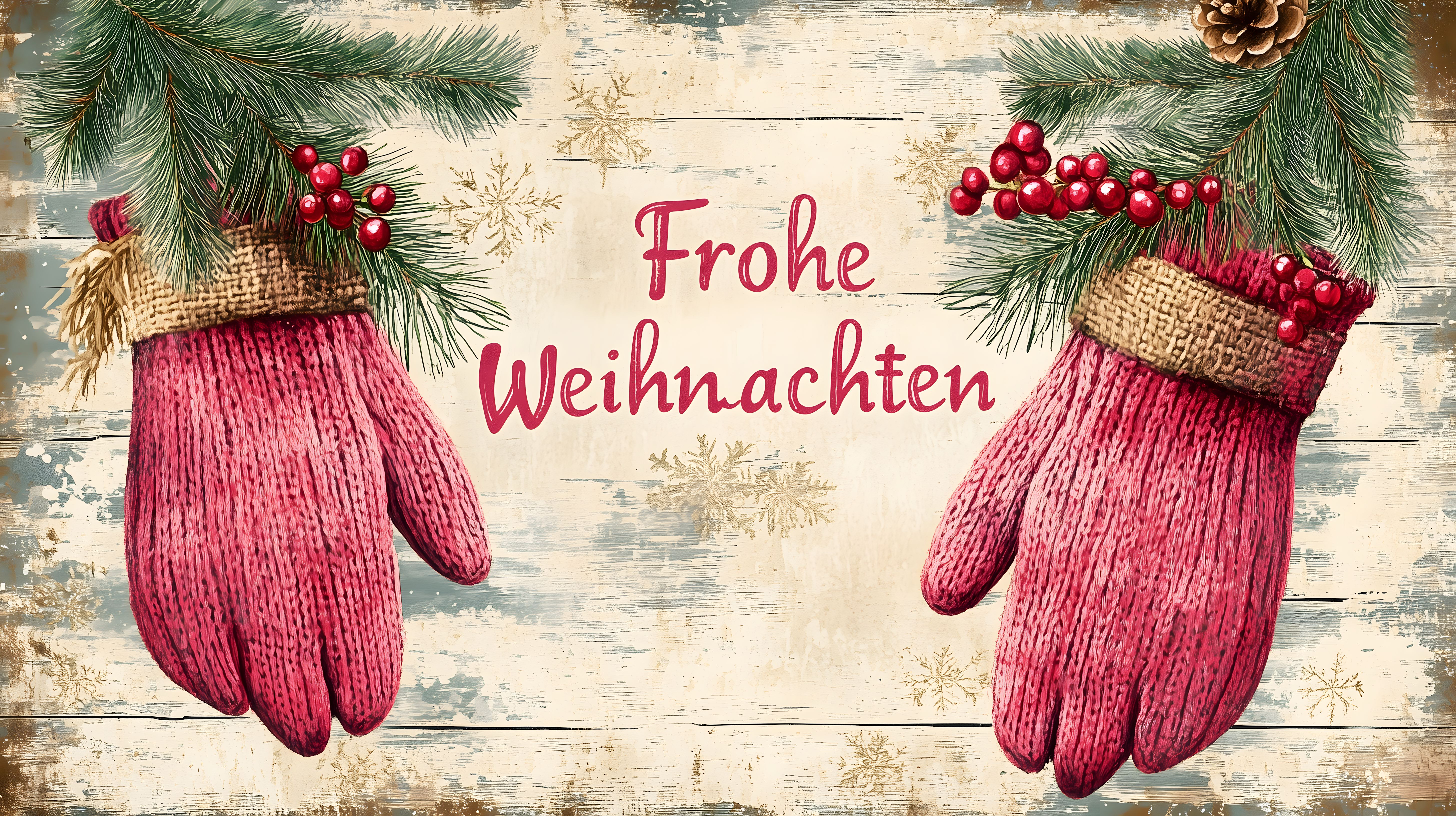 Dieses winterliche Weihnachtsbild zeigt eine liebevolle Dekoration mit Tannenzweigen, roten Beeren und zwei roten Strickhandschuhen vor einem rustikalen Holzhintergrund. Der Text 'Frohe Weihnachten' ist in kräftiger, roter Schrift dargestellt und verleiht der Szene einen festlichen Charakter. Die Komposition ist symmetrisch aufgebaut und schafft eine gemütliche, frostige Atmosphäre.