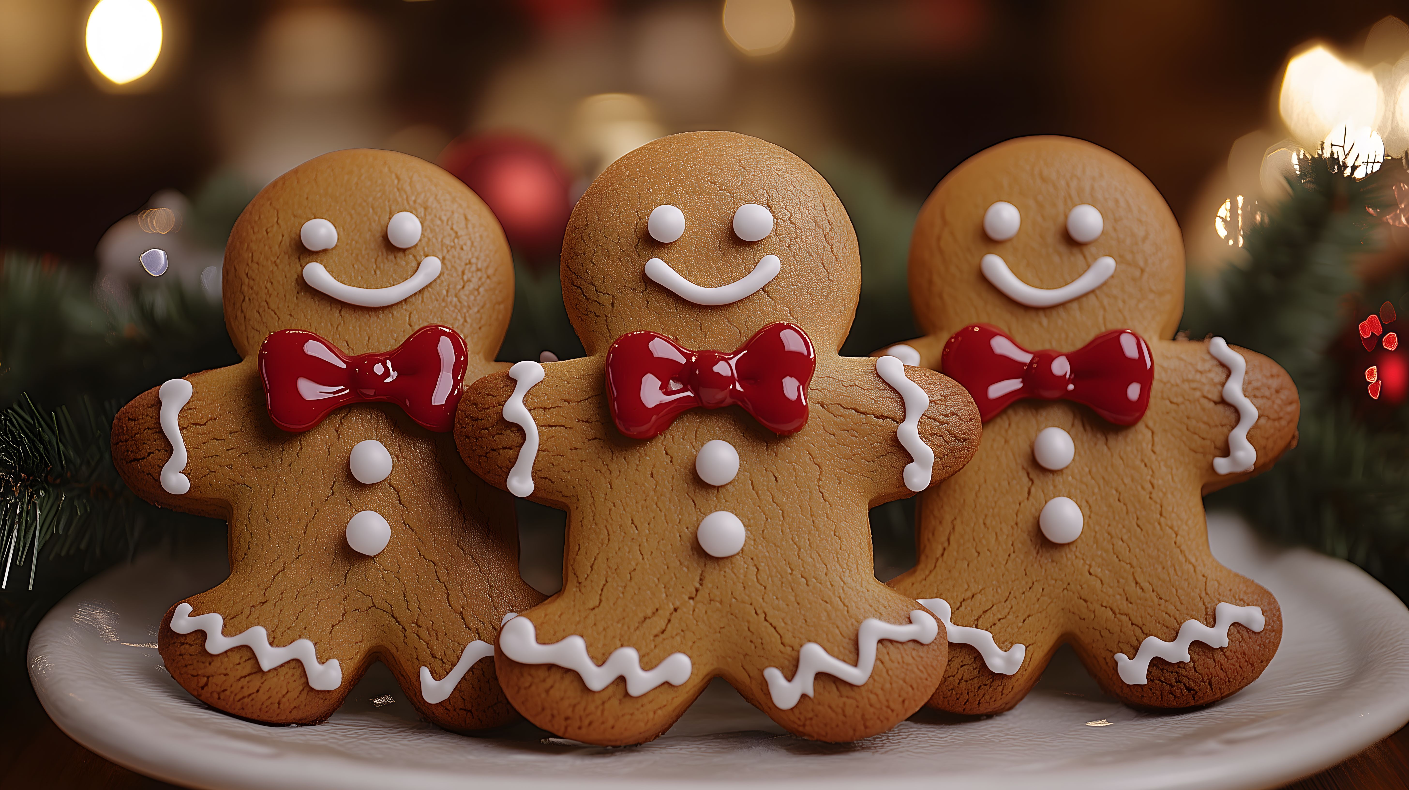 Dieses stimmungsvolle Foto zeigt drei fröhliche Lebkuchenmänner mit roten Schleifen als Fliegen. Sie stehen auf einem Teller vor einem weihnachtlich geschmückten Hintergrund und lächeln den Betrachter an. Das Bild ist in warmen Braun- und Rottönen gehalten und vermittelt eine festliche, gemütliche Atmosphäre. Es eignet sich hervorragend als kostenloses Stockfoto für Weihnachtsdekorationen, Backwaren-Rezepte, Feiertagsgrüße oder ähnliche Anwendungen in hoher Auflösung und unter Creative-Commons-Lizenz.