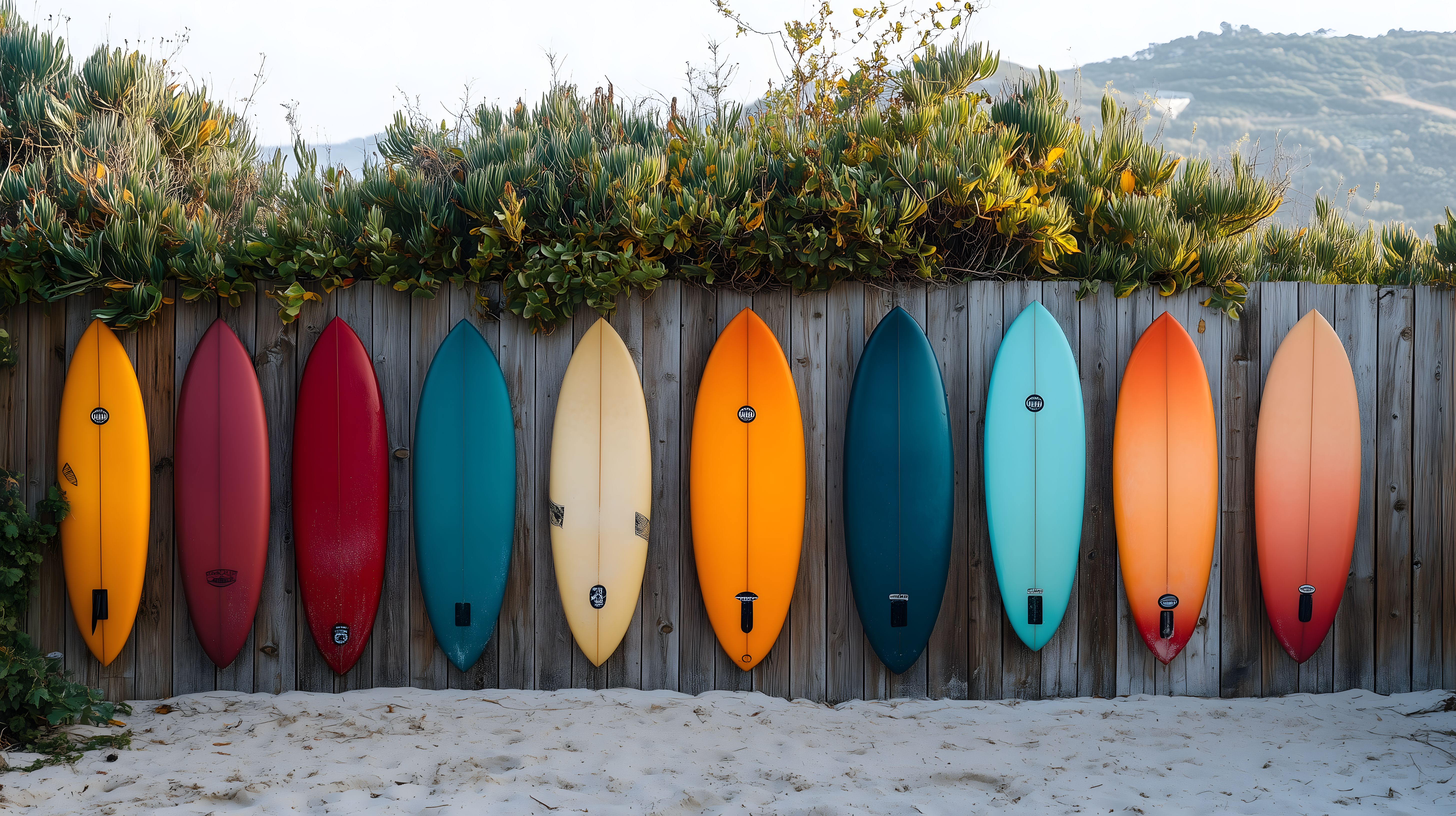 Dieses farbenfrohe Foto zeigt eine Reihe bunter Surfbretter, die an einem Holzzaun am Strand aufgehängt sind. Die Bretter in kräftigen Farben wie Orange, Rot, Blau und Grün präsentieren sich vor dem Hintergrund einer natürlichen Umgebung mit Vegetation und Bergen in der Ferne. Die Komposition mit den aneinandergereihten Surfbrettern und der Kontrast zwischen den hölzernen Elementen und den leuchtenden Farben erzeugen eine sommerliche, urlaubsreife Stimmung. Dieses kostenlose Stockfoto in hoher Auflösung unter Creative-Commons-Lizenz eignet sich hervorragend für den Einsatz in Blogs, Websites, Social-Media-Beiträgen oder Werbekampagnen rund um die Themen Surfen, Sport, Outdoor-Aktivitäten und Sommerfeeling.