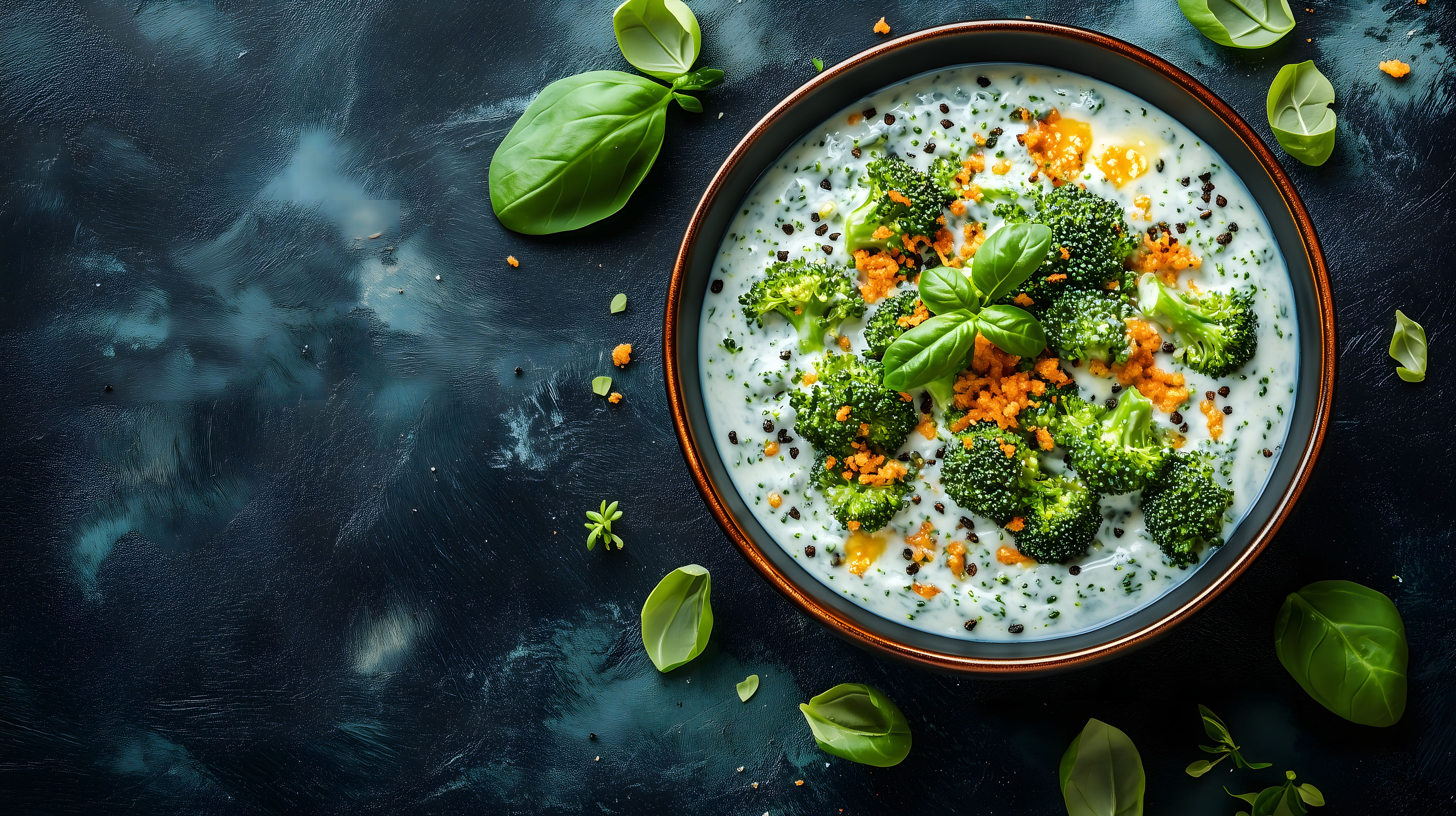 Das Bild zeigt eine Schüssel mit einer cremigen Käsesoße, in der frischer Brokkoli eingebettet ist. Die Soße hat eine sämige, einladende Konsistenz, die durch die grünen Brokkolistücke wunderbar akzentuiert wird. Das Gericht ist in einem rustikalen, natürlichen Ambiente fotografiert, mit zusätzlichen Brokkoliblättern und anderen grünen Elementen als Dekoration. Die Farbkomposition aus Grün, Orange und Weiß wirkt sehr harmonisch und appetitlich. Dieses Stockfoto eignet sich hervorragend für Verwendung in Rezeptsammlungen, Kochblogs, Werbung für gesunde Ernährung oder Lebensmittelkampagnen. Es ist in hoher Auflösung und unter einer Creative-Commons-Lizenz verfügbar.