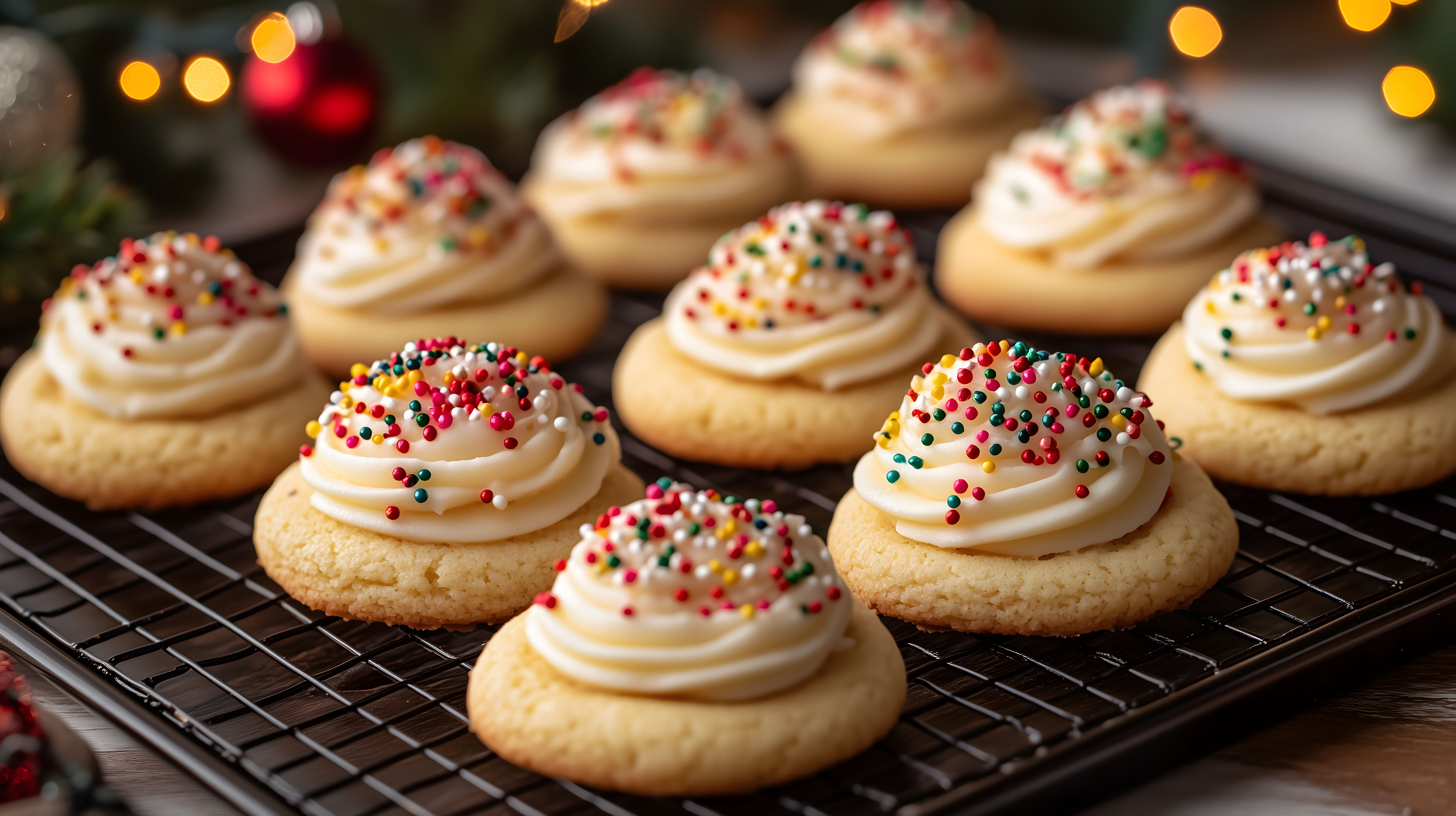 Dieses Bild zeigt frisch gebackene Weihnachtsplätzchen auf einem dunklen Rost-Gitter. Die Plätzchen sind mit einer cremigen Zuckerguss-Verzierung und bunten Streusel dekoriert, was ihnen ein festliches, feierliches Aussehen verleiht. Das Arrangement sieht sehr appetitlich und einladend aus, perfekt für Weihnachtsbackaktionen, Geschenke oder die Verwendung in Weihnachtsdekorationen, Rezeptbüchern, Blogbeiträgen und anderen Medien. Als hochwertiges, kostenloses Stockfoto in hoher Auflösung unter Creative-Commons-Lizenz kann es vielfältig eingesetzt werden.