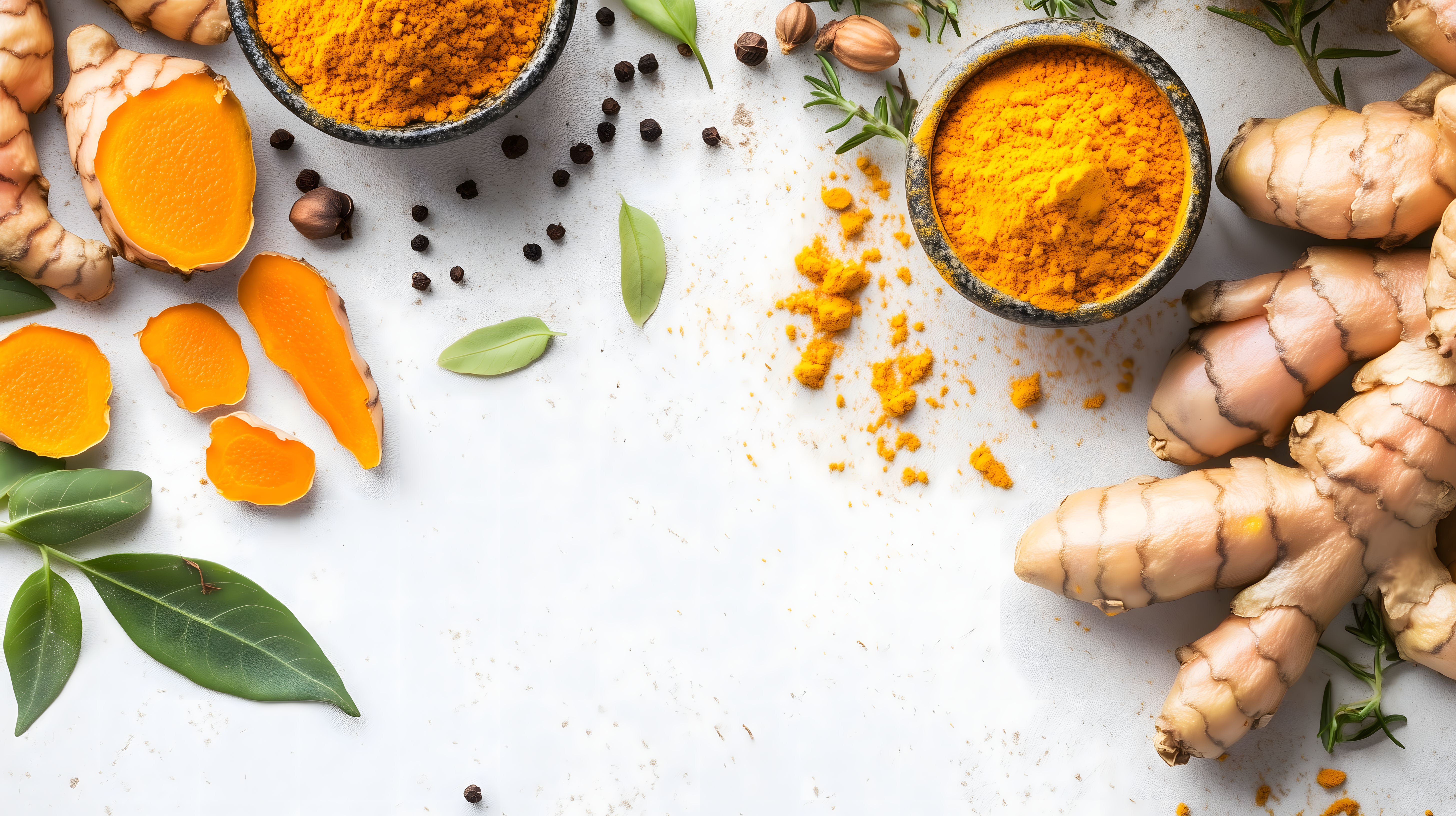 Dieses Foto zeigt eine Auswahl an frischen Kurkumawurzeln, Kurkumapulver sowie weitere Gewürze und Kräuter auf einem weißen Hintergrund. Die Anordnung ist minimalistisch und fokussiert sich auf die Zutaten selbst, ohne ablenkende Elemente. Die satten Farben der Kurkuma, die grünen Blätter und die braunen Gewürze schaffen eine stimmungsvolle, natürliche Atmosphäre.