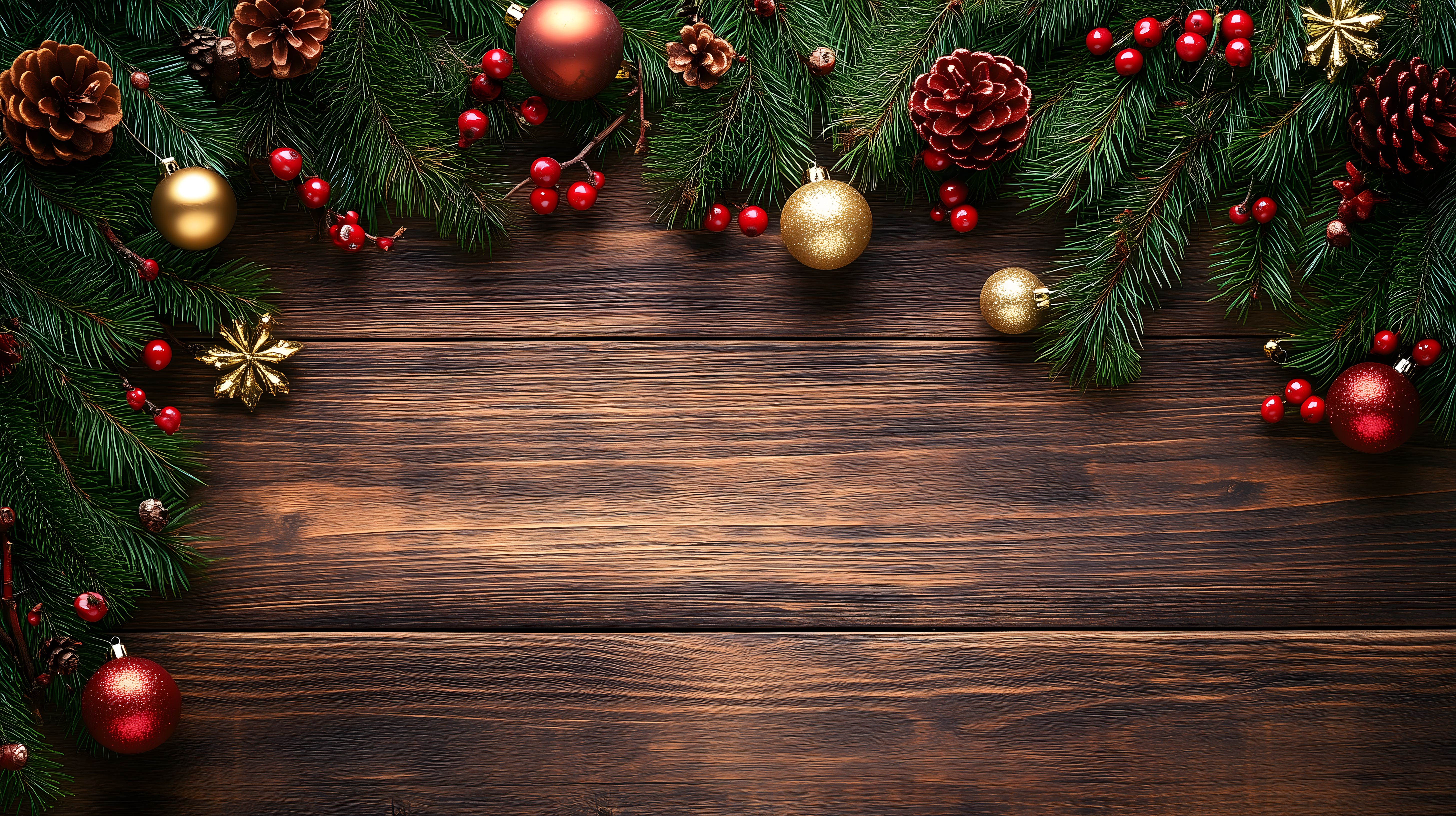 Dieses stimmungsvolle Weihnachtsfoto zeigt eine festliche Dekoration mit Tannenzweigen, Weihnachtskugeln, Zapfen und roten Beeren auf einem rustikalen Holzhintergrund. Die warmen Farbtöne von Rot, Gold und Grün verleihen der Szene eine gemütliche und einladende Atmosphäre. Die Komposition mit dem leeren Platz in der Mitte bietet viel Raum für Text oder andere gestalterische Elemente. Dieses hochauflösende Weihnachtsfoto ist ein kostenloses Stockfoto, das unter Creative Commons-Lizenz verwendet werden kann, z.B. für Weihnachts-Blogs, Newsletter-Layouts, Social-Media-Posts oder Werbematerialien.
