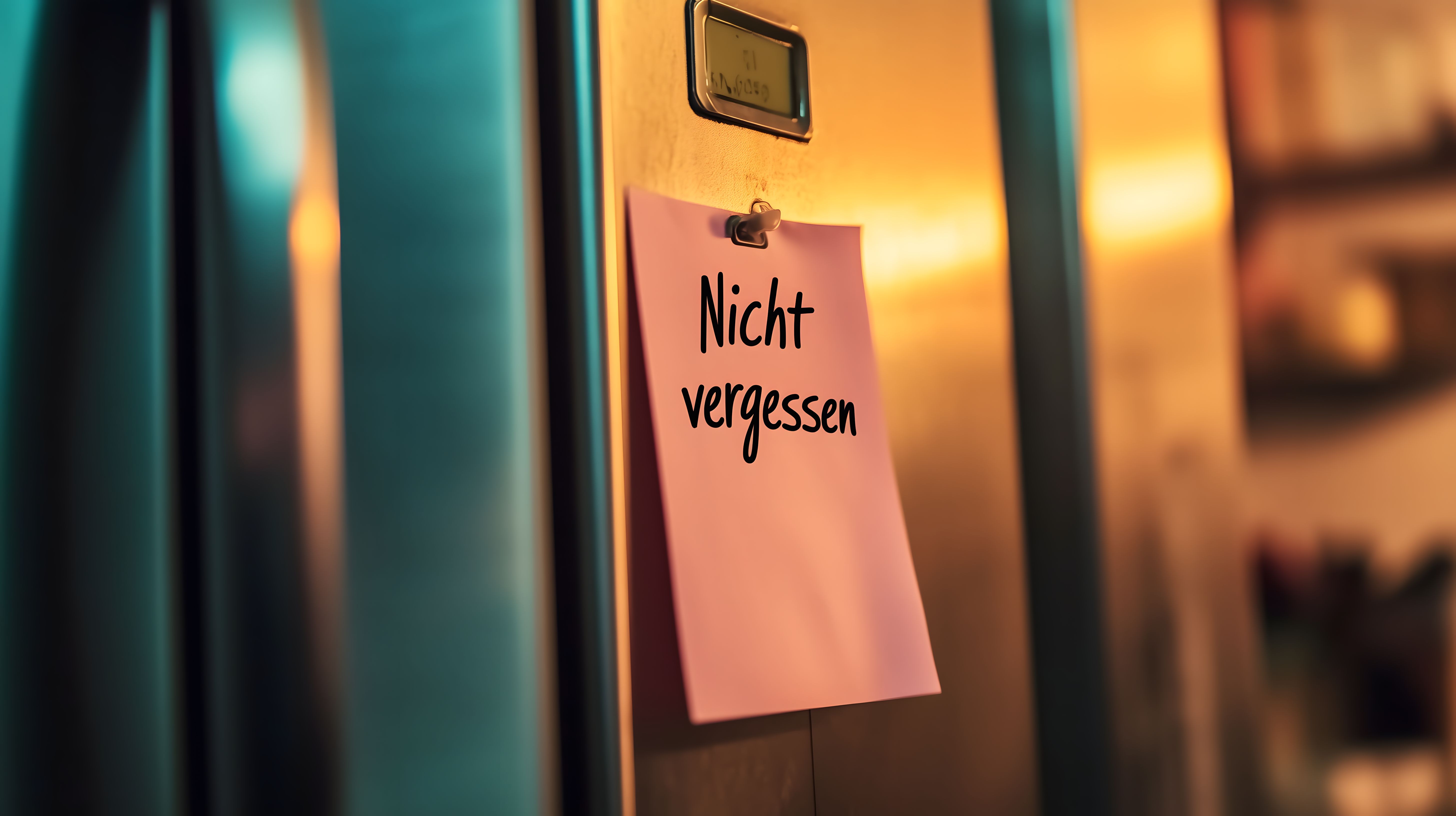 Dieses Bild zeigt einen rosaroten Haftzettel, der an einem Kühlschrankmagnet befestigt ist. Der Zettel trägt die deutsche Aufschrift 'Nicht vergessen'. Der Hintergrund ist leicht unscharfgezeichnet und zeigt einen grünlichen und orangefarbenen Ton, der einen starken Kontrast zum rosafarbenen Haftzettel bildet. Das Foto vermittelt eine minimalistische und aufgeräumte Stimmung und könnte sich gut für den Einsatz in Blogbeiträgen, Newslettern, Social-Media-Posts oder Werbematerialien eignen, die eine organisierte und strukturierte Arbeits- oder Haushaltsumgebung darstellen wollen. Dieses kostenlose Stockfoto in hoher Auflösung steht unter einer Creative-Commons-Lizenz zur Verfügung.