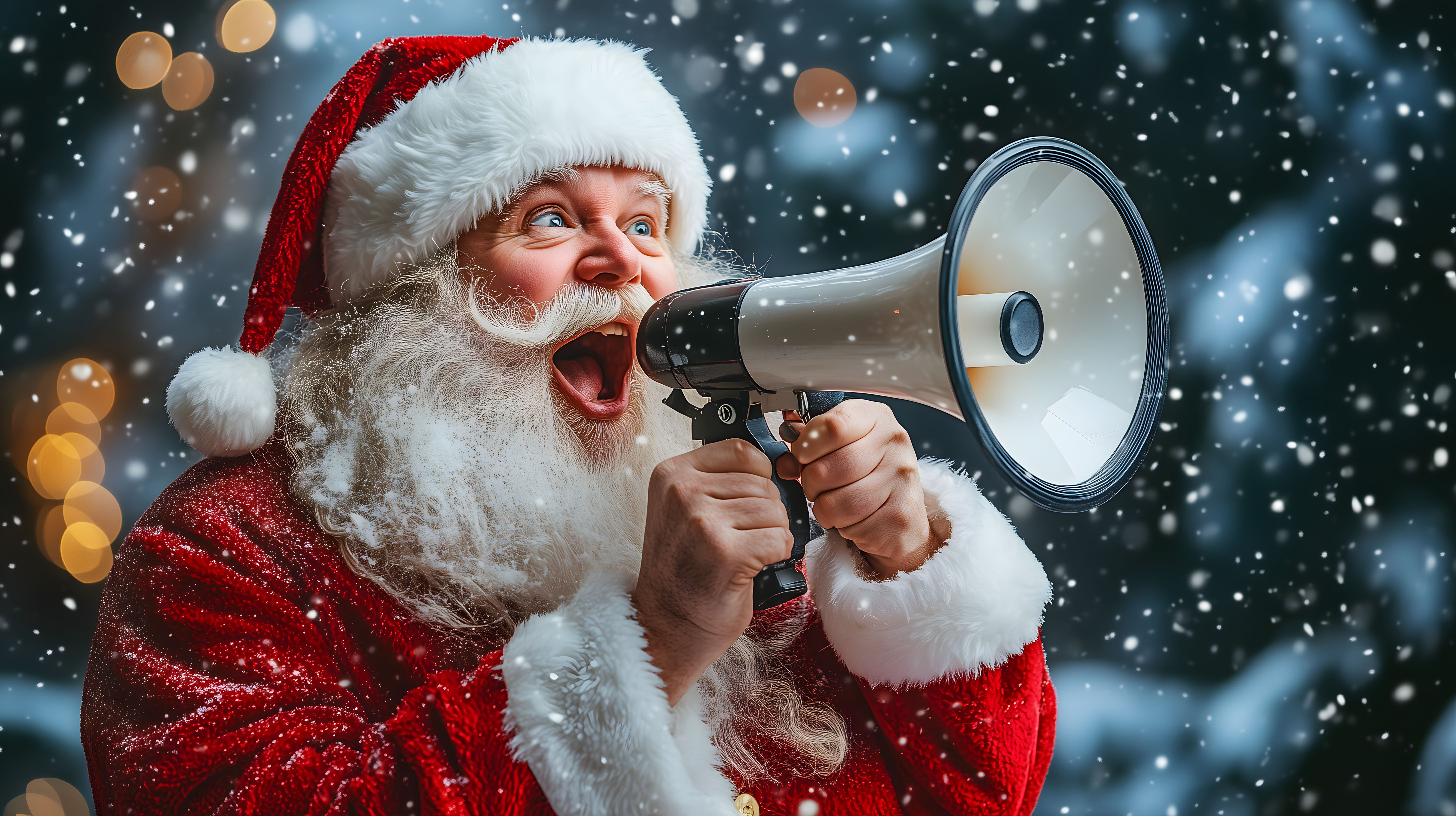 Das Bild zeigt einen fröhlichen, lächelnden Weihnachtsmann, der ein Megafon in der Hand hält und in einer verschneiten Winterlandschaft steht. Der Weihnachtsmann trägt einen roten, glitzernden Mantel mit Fellbesatz und eine passende rote Mütze. Hinter ihm ist eine verschwommene Winterkulisse mit Schneefall und Lichtern zu sehen. Das Bild vermittelt eine festliche, energiegeladene Stimmung und eignet sich perfekt für die Verwendung in Weihnachtsdekorationen, Grußkarten, Newslettern oder Werbematerialien rund um die Feiertage. Dieses hochauflösende Stockfoto ist kostenlos und unter Creative-Commons-Lizenz verfügbar.