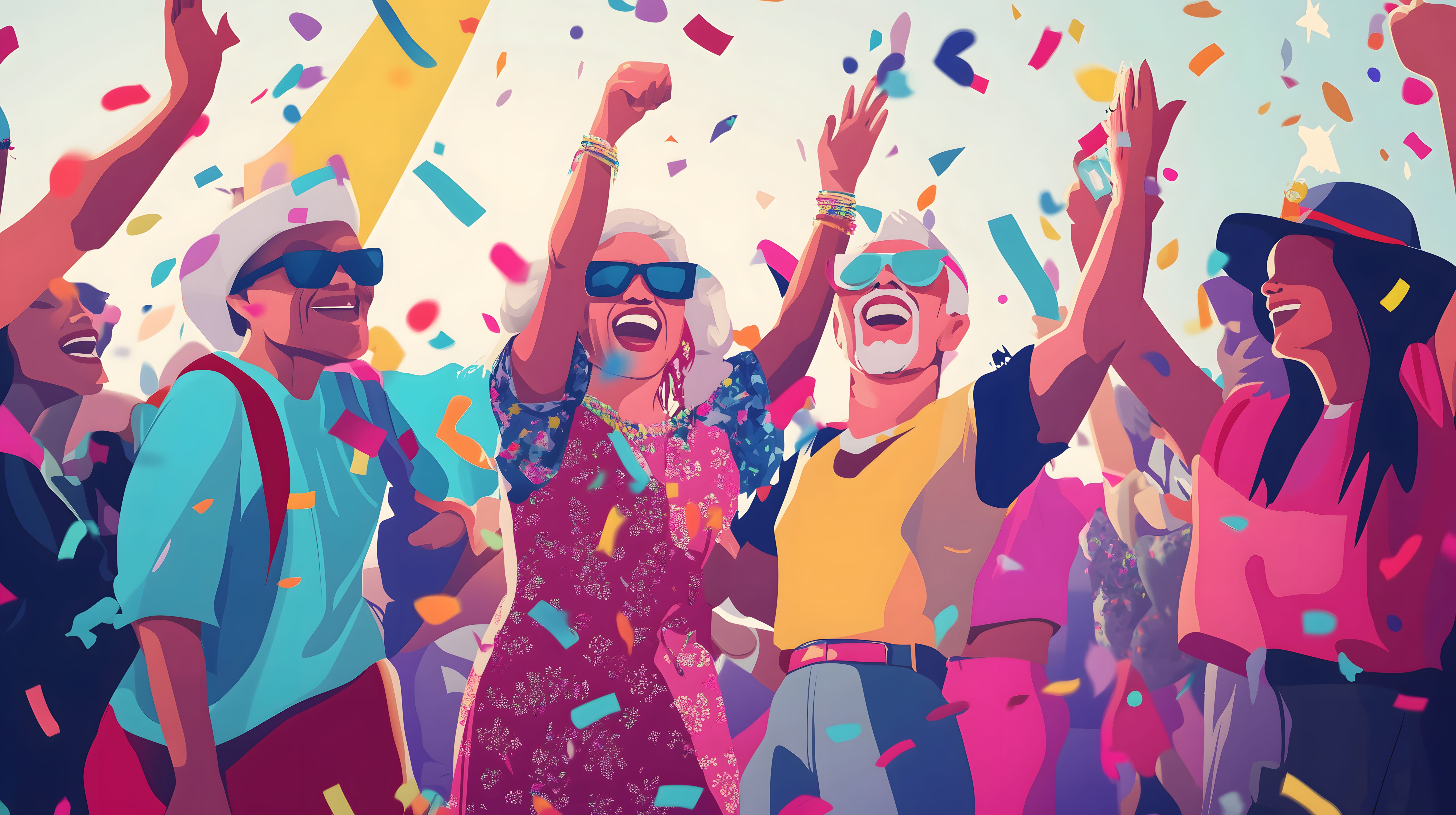 Dieses lebendige Bild zeigt eine Gruppe fröhlicher, älterer Menschen, die in einem Konfettiregensturm feiern. Die bunte, ausschwingenden Farbpalette in Pink, Rot, Blau und Gelb verleiht dem Motiv eine ausgelassene, energiegeladene Stimmung. Die lachenden Gesichter, die erhobenen Arme und die luftigen Bewegungen der Kleidung vermitteln ein Gefühl von Lebensfreude und Unbeschwertheit. Dieses Stockfoto eignet sich hervorragend für den Einsatz in Blogs, Newslettern, Social-Media-Posts oder Werbekampagnen rund um Themen wie Feierlichkeiten, Gemeinschaft und positiven Lebensstil. Das hochauflösende Bild steht unter einer kostenlosen Creative-Commons-Lizenz zum Download bereit.