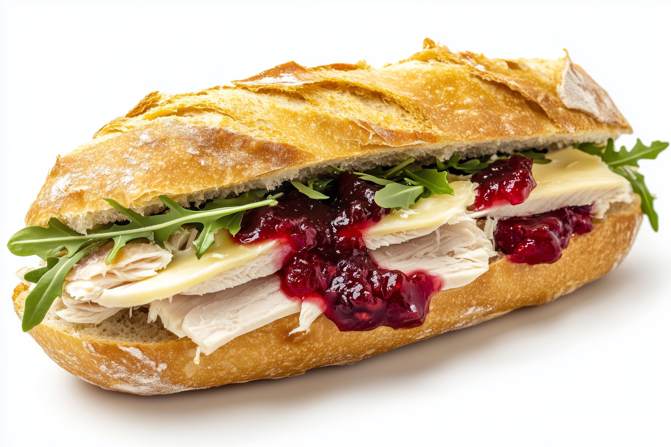 Das Foto zeigt ein appetitliches französisches Sandwich mit einer Füllung aus Putenfleisch, cremigem Brie-Käse, saftigen Preiselbeeren und frischem Rucola-Salat. Das knusprige Baguette ist golden-braun gebacken und verleiht dem Gericht einen rustikalen Charakter. Die Kombination der Zutaten schafft einen harmonischen Kontrast aus würzigem Fleisch, cremigem Käse und den süß-säuerlichen Preiselbeeren. Dieses Foto eignet sich hervorragend für die Verwendung in Rezeptbüchern, Foodblogs, Social-Media-Kanälen oder Werbematerialien rund um das Thema Kulinarik. Es ist ein kostenloses Stockfoto in hoher Auflösung und unter einer Creative-Commons-Lizenz verfügbar.