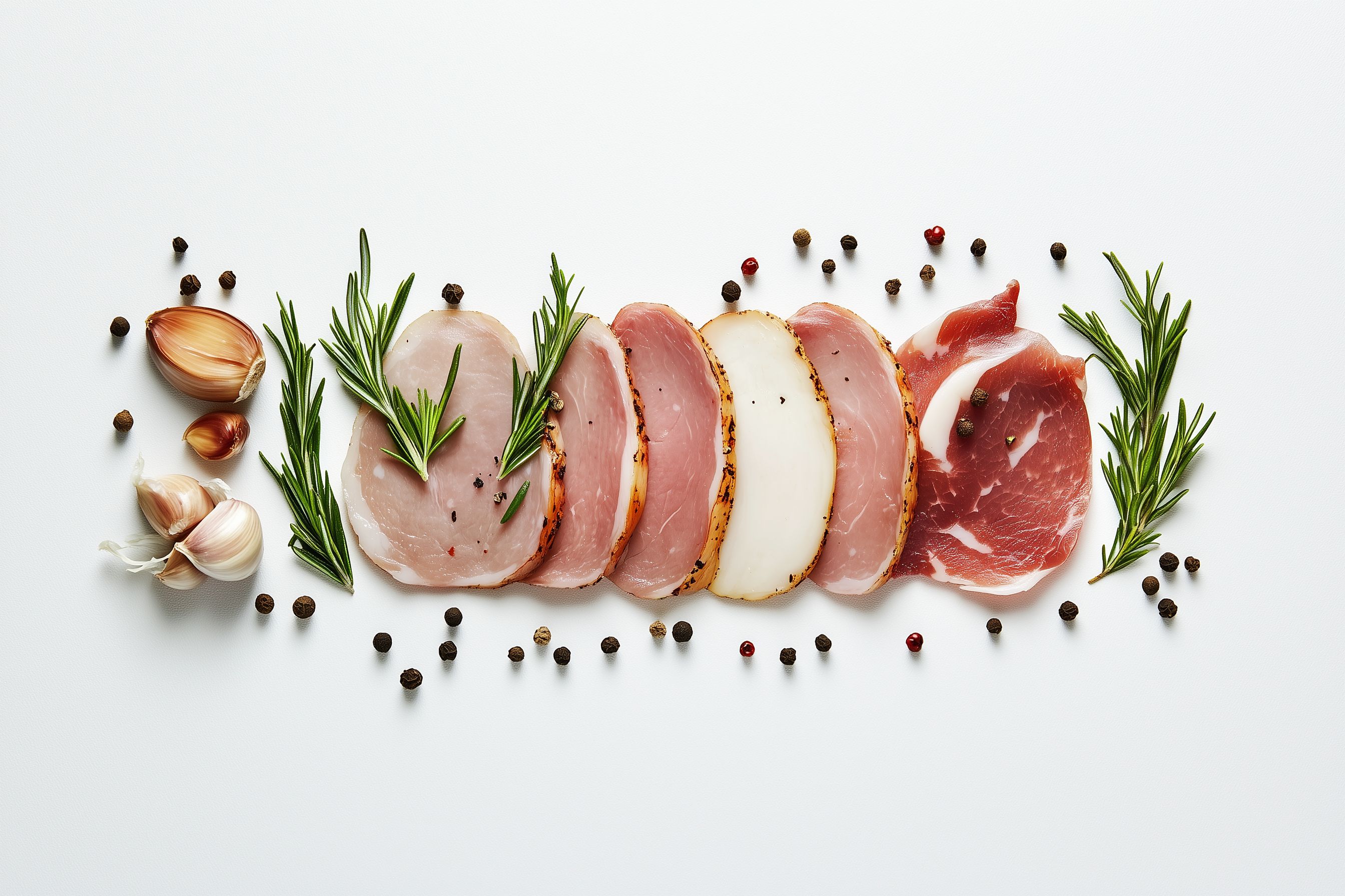 Dieses appetitanregende Stockfoto zeigt eine elegante Komposition aus verschiedenen Wurstwaren, Kräutern und Gewürzen. Auf weißem Untergrund sind die Zutaten kunstvoll und minimalistisch arrangiert, was einen appetitlichen und frischen Eindruck vermittelt. Die Farbkontraste zwischen den rosa, weißen und grünen Elementen sowie der Einsatz von Rosmarinzweigen, Knoblauchzehen und Pfefferkörnern verleihen dem Bild eine natürliche, rustikale Anmutung. Das Foto eignet sich hervorragend für den Einsatz in Rezepten, Kochbüchern, Gastronomie-Werbung oder Social-Media-Posts zu kulinarischen Themen. Als kostenloses Stockfoto in hoher Auflösung unter Creative-Commons-Lizenz ist es frei nutzbar.