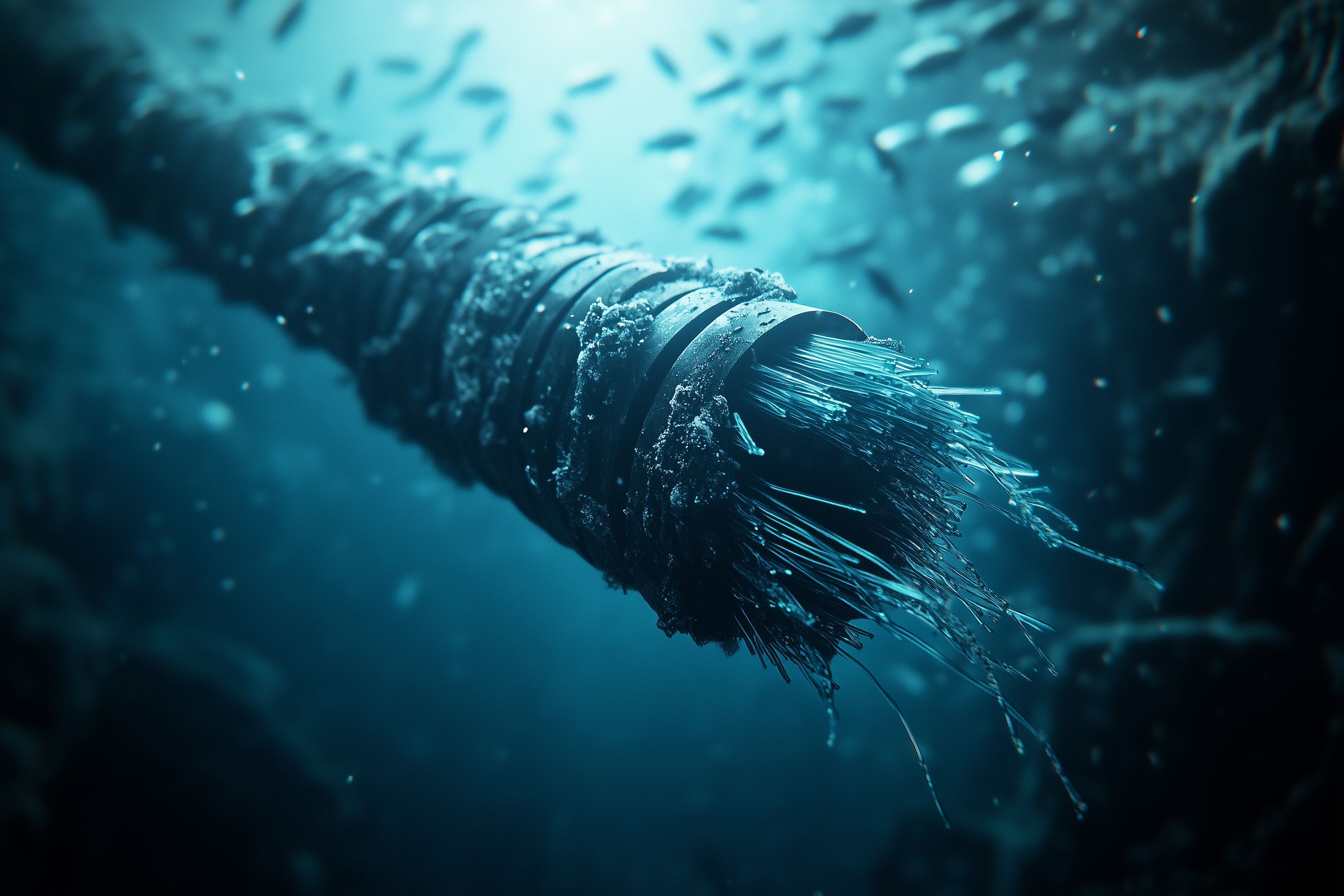Das Bild zeigt ein gefrorenes Unterwasserkabel, das tief im Meer liegt. Das Kabel ist von Eis überzogen und wird von der dunkelblauen Meerestiefe umgeben. Die Perspektive ist leicht schräg, wodurch die Textur und Struktur des vereisten Kabels deutlich sichtbar wird. Die faszinierende Aufnahme vermittelt eine Ahnung von den herausfordernden Bedingungen, denen Unterwasserkabel in der Tiefsee ausgesetzt sind. Dieses Stockfoto eignet sich hervorragend für den Einsatz in Artikeln, Blogs oder Social-Media-Beiträgen, die sich mit Themen wie Meeresforschung, Unterwassertechnologie oder Ozeanschutz befassen. In hoher Auflösung und unter einer Creative-Commons-Lizenz verfügbar, kann es kostenlos für redaktionelle Zwecke genutzt werden.
