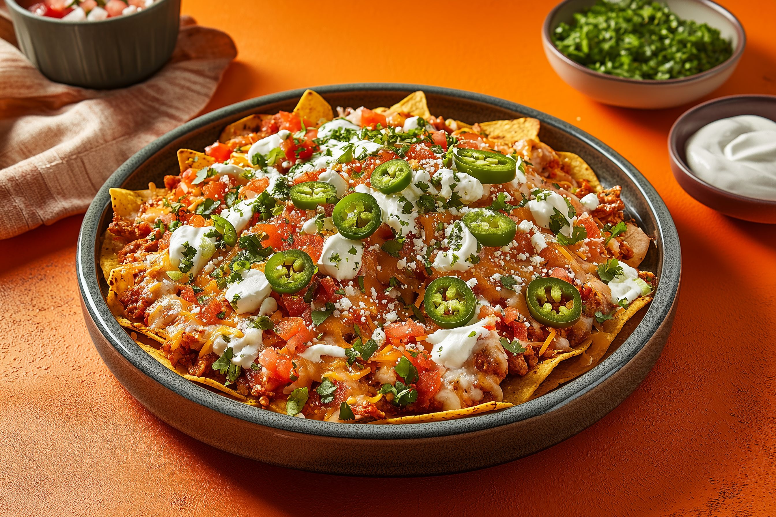 Das Bild zeigt eine rustikale Schüssel voller leckerer Nachos, bedeckt mit einer Mischung aus geschmorten Bohnen, Tomaten, Käse, Saurer Sahne, frischen Jalapeños und fein gehackten Kräutern. Die Nachos haben eine schöne, goldbraune Farbe und sind appetitlich angerichtet. Der orangefarbene Hintergrund verleiht dem Gericht einen warmen, einladenden Farbton. Dieses Foto eignet sich perfekt für Blogs, Newsletter, Social-Media-Posts oder Werbematerial rund um mexikanische Küche, Snacks oder leckere Mahlzeiten. Es ist ein hochwertiges, kostenloses Stockfoto in einer hohen Auflösung, das unter einer Creative-Commons-Lizenz zur Verfügung steht.