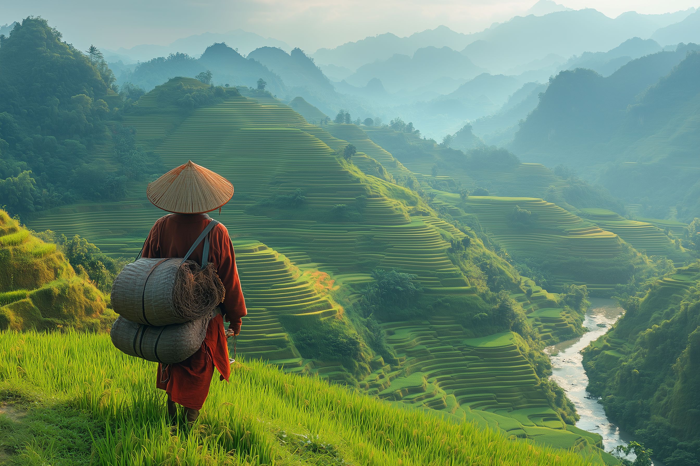 Das Foto zeigt eine malerische Landschaft mit terrassenförmigen Reisfeldern, die sich über die Hänge der Berge erstrecken. In der Mitte des Bildes steht ein traditionell gekleideter Bauer mit einem Strohhut, der einen Korb auf dem Rücken trägt. Der üppige grüne Bewuchs der Reisfelder kontrastiert mit den nebelverhüllten blauen Bergen im Hintergrund, was eine stimmungsvolle und friedliche Atmosphäre schafft.