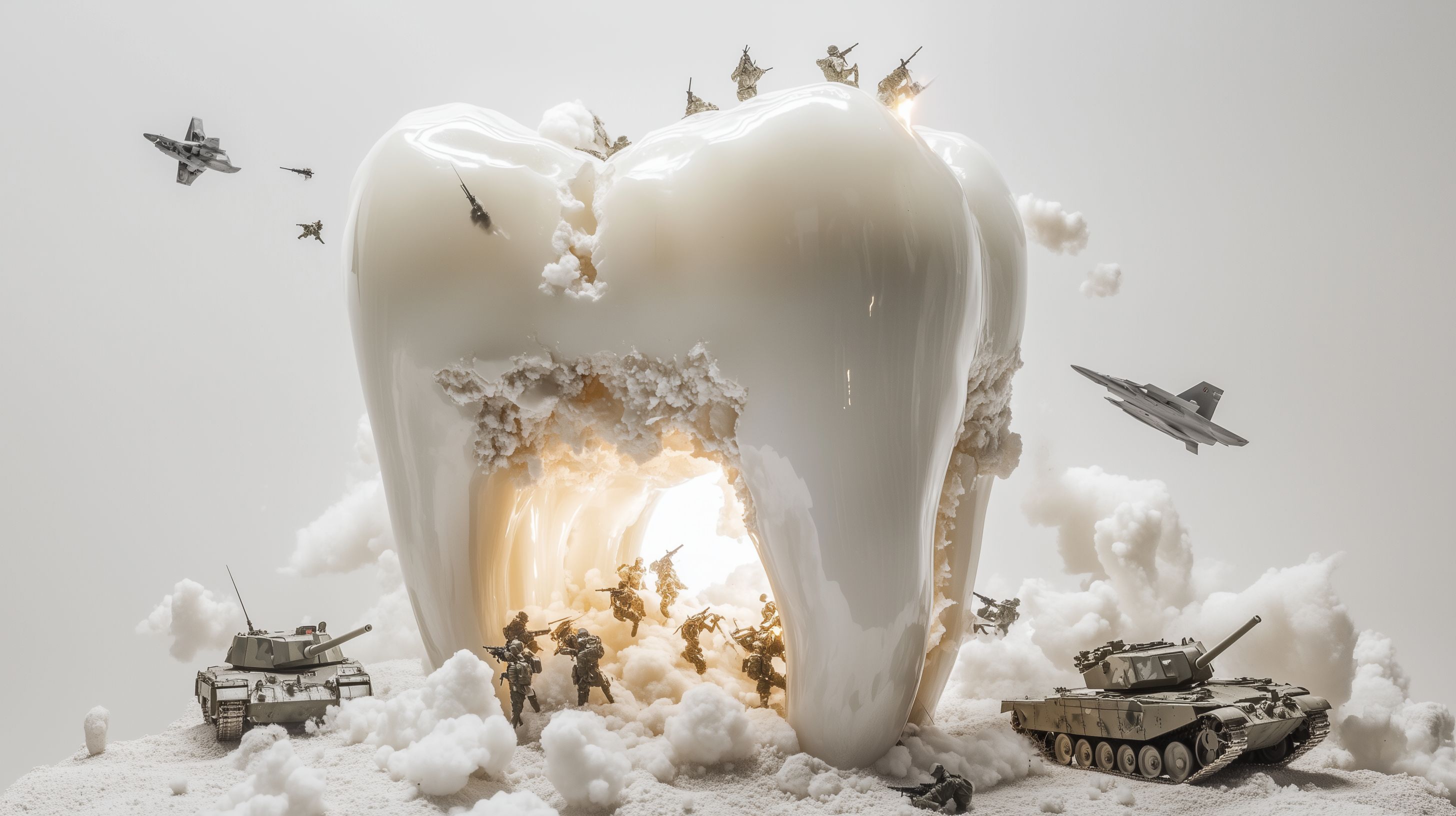 Das Bild zeigt eine surreale Darstellung eines Zahnkrieges. Ein riesiger Zahn, von dem Teile abgebröckelt sind, steht im Mittelpunkt der Szene, umgeben von Rauch und Explosionen. Panzer und Kampfflugzeuge sind in den Zahn eingedrungen, als würden sie ihn bombardieren. Die Komposition ist kraftvoll und dramatisch, die Farben düster und bedrohlich. Diese Darstellung kann als Metapher für den Kampf gegen Krankheiten, insbesondere Karies, interpretiert werden. Als kostenloses Stockfoto in hoher Auflösung unter Creative-Commons-Lizenz eignet es sich für den Einsatz in Blogs, Newslettern, Social-Media-Beiträgen oder Werbematerialien, die sich mit Gesundheit, Zahnmedizin oder konzeptueller Kunst beschäftigen.