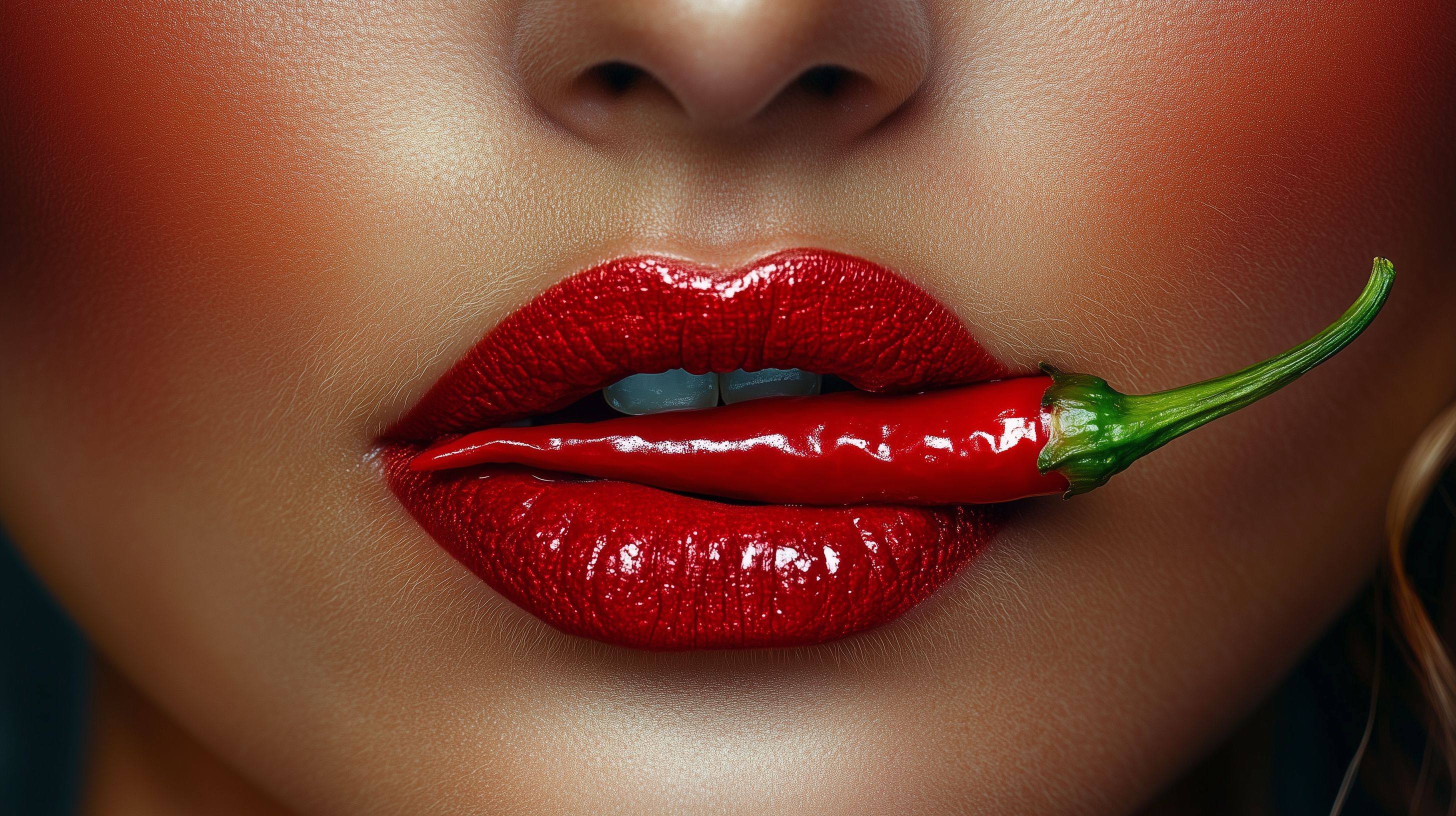 Das Foto zeigt eine sinnliche Nahaufnahme einer weiblichen Lippe, auf der ein glänzend roter Lippenstift aufgetragen ist. In den Lippen steckt eine grüne Chilischote, die einen spannenden Kontrast zu dem intensiven Rot des Lippenstifts bildet. Das Bild strahlt eine provokante Erotik und Sinnlichkeit aus, die für Lifestyle-Content in Bereichen wie Mode, Beauty oder Food ideal wäre. Es eignet sich hervorragend als hochwertiges, kostenloses Stockfoto für Blog-Beiträge, Newsletter-Grafiken, Social-Media-Posts oder Werbemotive mit einem modernen, urbanen Flair.